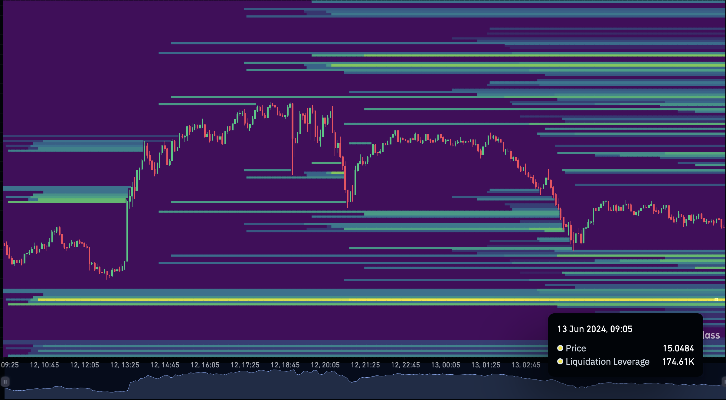 - Liquidations-Heatmap: Dieser Indikator prognostiziert, wo großangelegte Liquidationen auftreten könnten. Händler können die Heatmap nutzen, um Bereiche hoher Liquidität zu identifizieren (normalerweise in Gelb dargestellt). Darüber hinaus kann die Konzentration potenzieller Hochliquiditätsbereiche die Preise in die Region ziehen.
