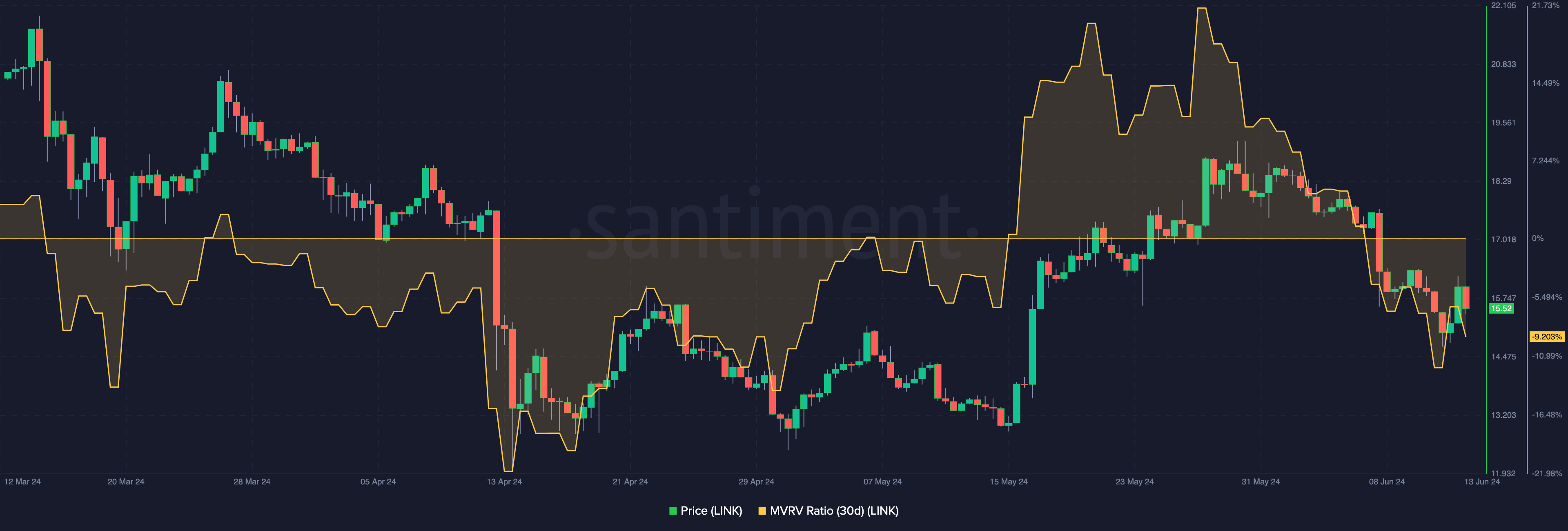 Ein weiteres Szenario ereignete sich im April, als der Wert bei -21,37 Prozent lag. In dieser Zeit stieg LINK von 13,08 USD auf 15,62 USD.