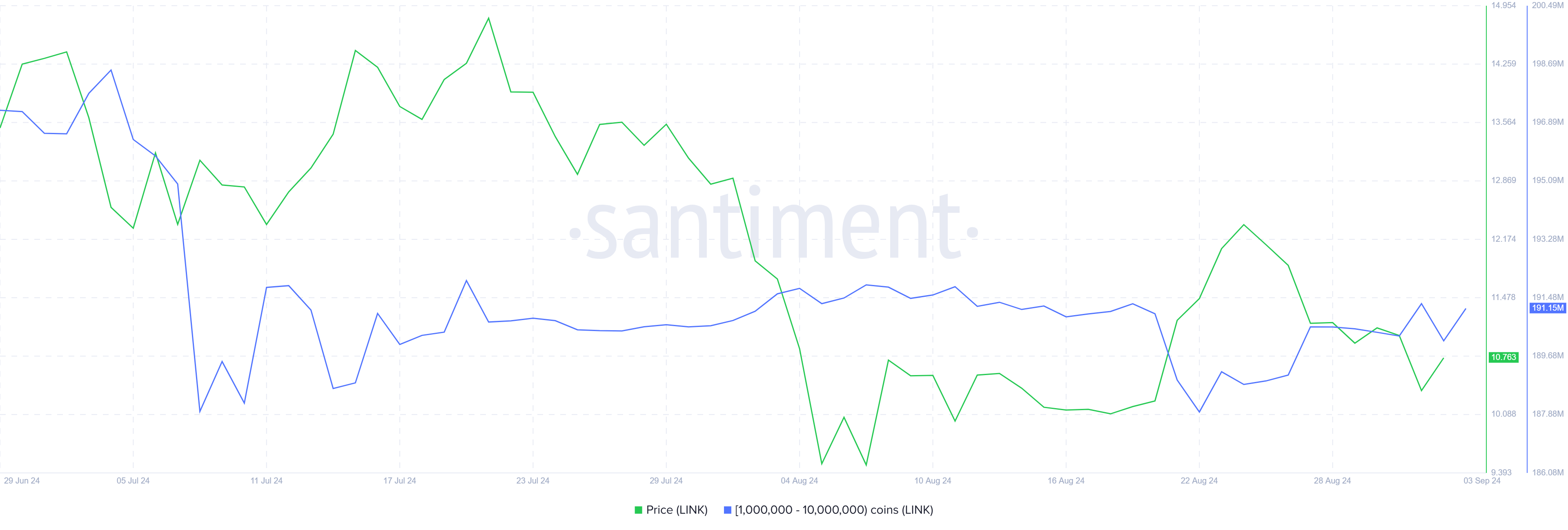 SponsoredZudem waren eine wichtige Gruppe von Investoren ungewöhnlich bärisch. Die Adressen, die zwischen einer Million und zehn Millionen LINK halten, haben sehr langsam akkumuliert. Trotz der niedrigen Preise haben diese Investoren in den letzten elf Tagen nur LINK im Wert von 40 Millionen USD gekauft.