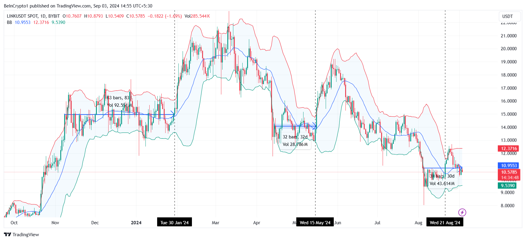 Obwohl die Bänder Ende August zusammengedrückt wurden und LINK anstieg, scheiterte es aufgrund der bärischen makrofinanziellen Märkte. Dieses gescheiterte Ausbrechen verlängerte die nächste mögliche Squeeze-Phase und ließ mehr Raum für eine Konsolidierung.
