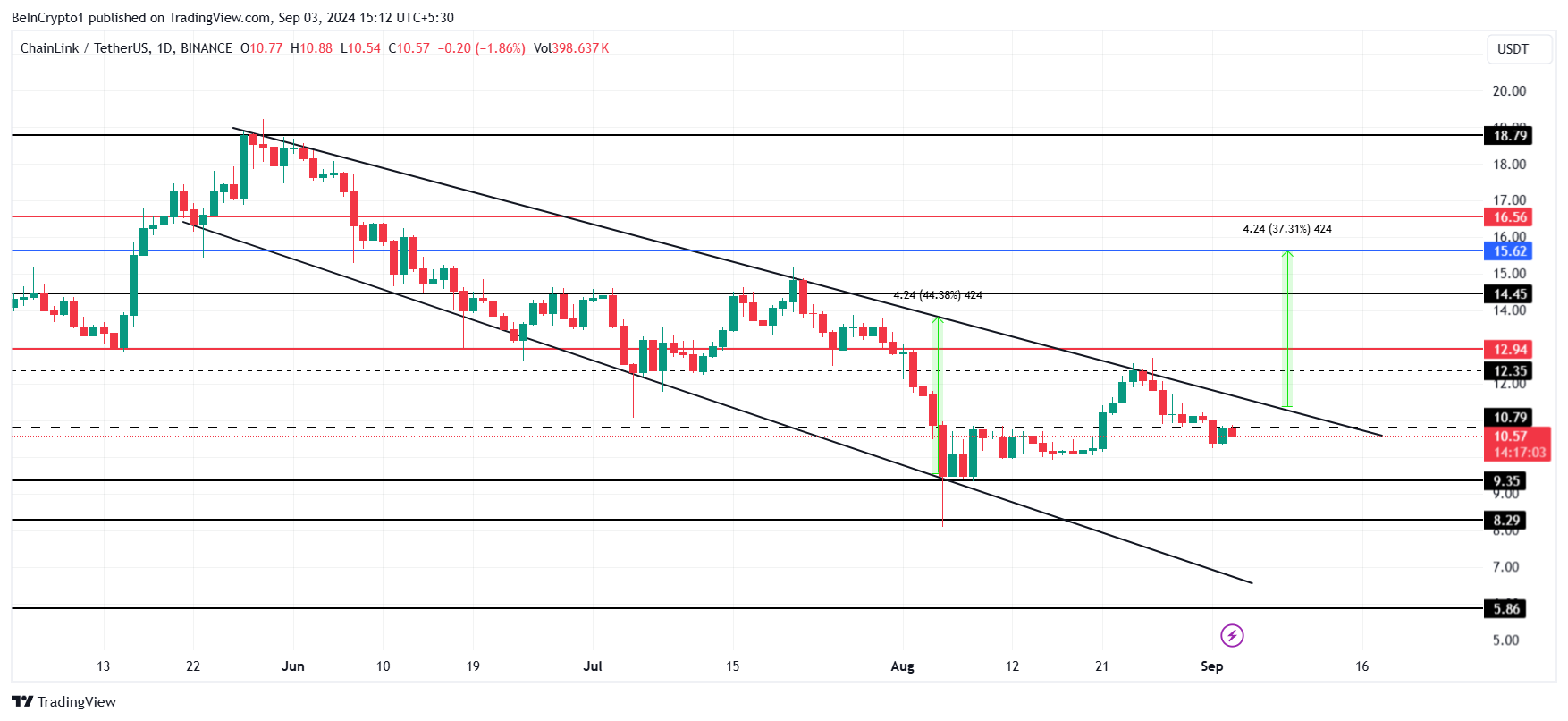 Der Kurs von Chainlink wird derzeit zu 10,57 USD gehandelt und versucht, die Barriere von 10,79 USD als Unterstützung zu nutzen. Diese lokale Unterstützungsebene ist entscheidend für LINK, da ein Abprallen dem Altcoin helfen könnte, aus dem sich erweiternden absteigenden Keil auszubrechen.