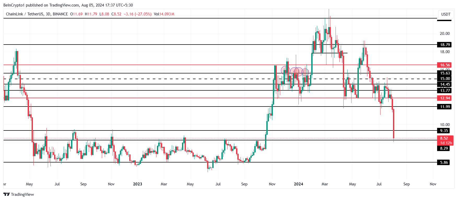 Wenn der Chainlink-Kurs auf die genannten Bedingungen reagiert, könnte dies einen weiteren Rückgang verhindern. Nach einem Rückgang von 27 Prozent in den letzten 24 Stunden liegt der Altcoin über der Unterstützung von 8,29 USD und wird zu 8,52 USD gehandelt, was eine mögliche Erholung andeutet.