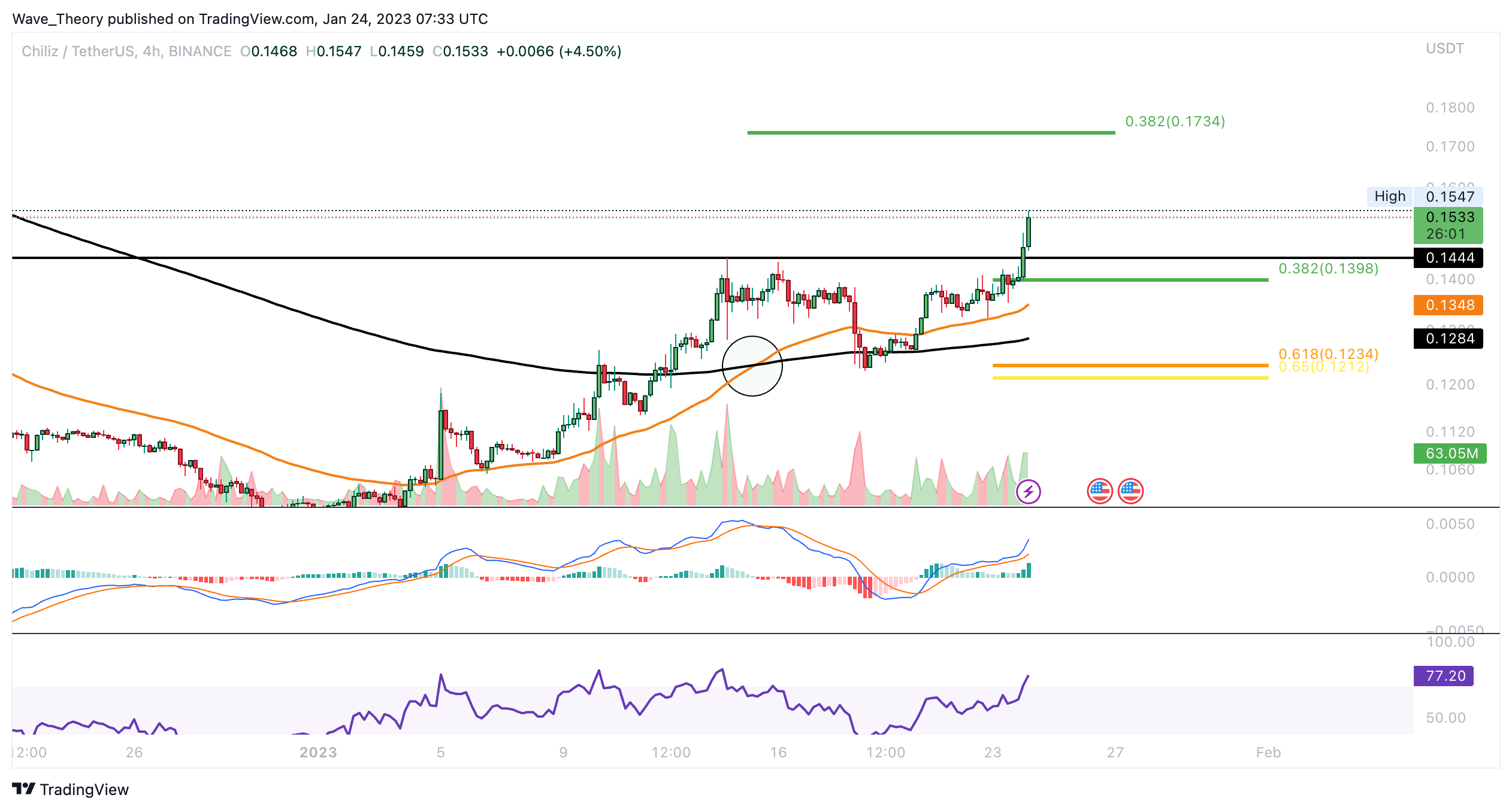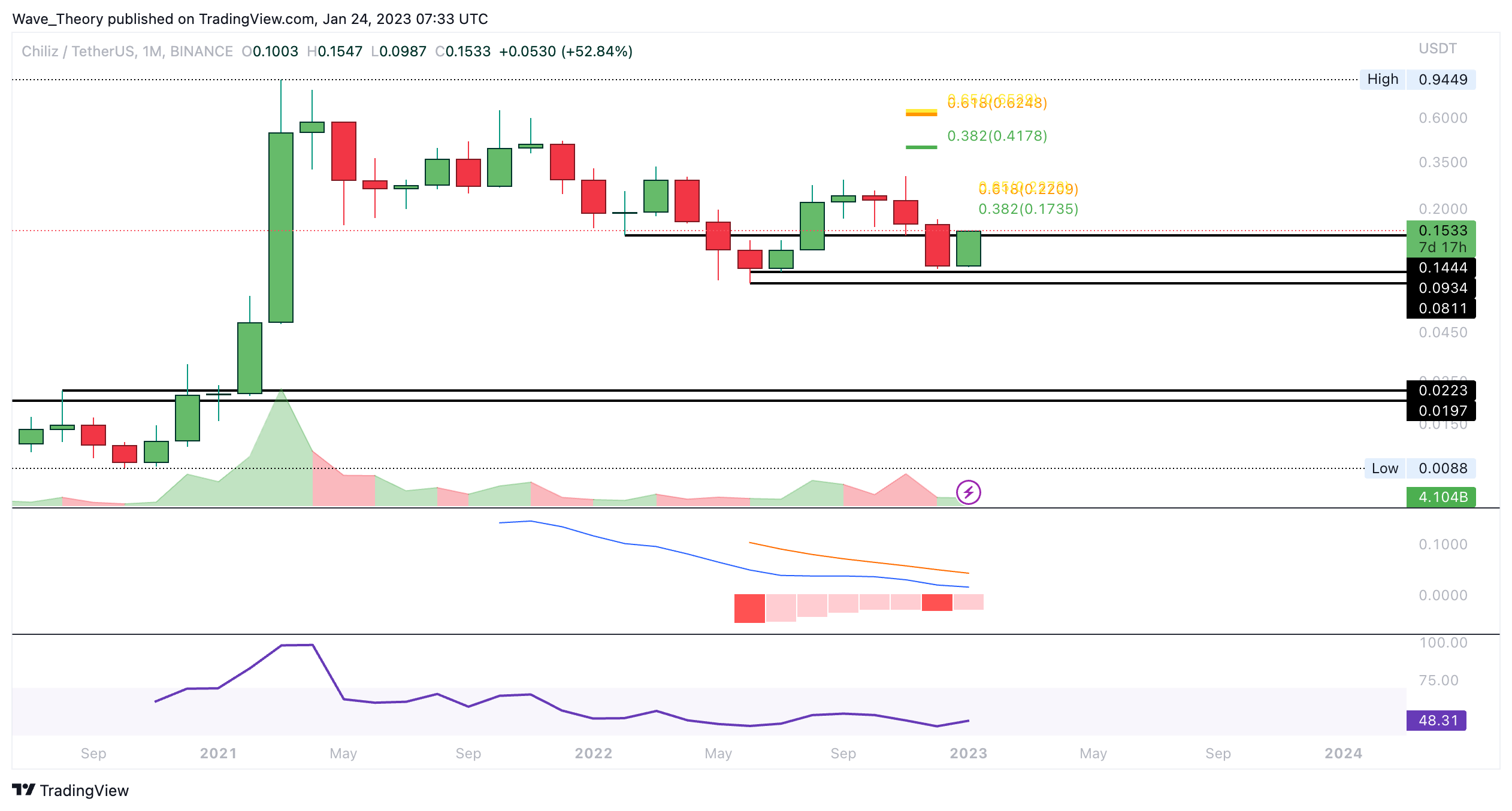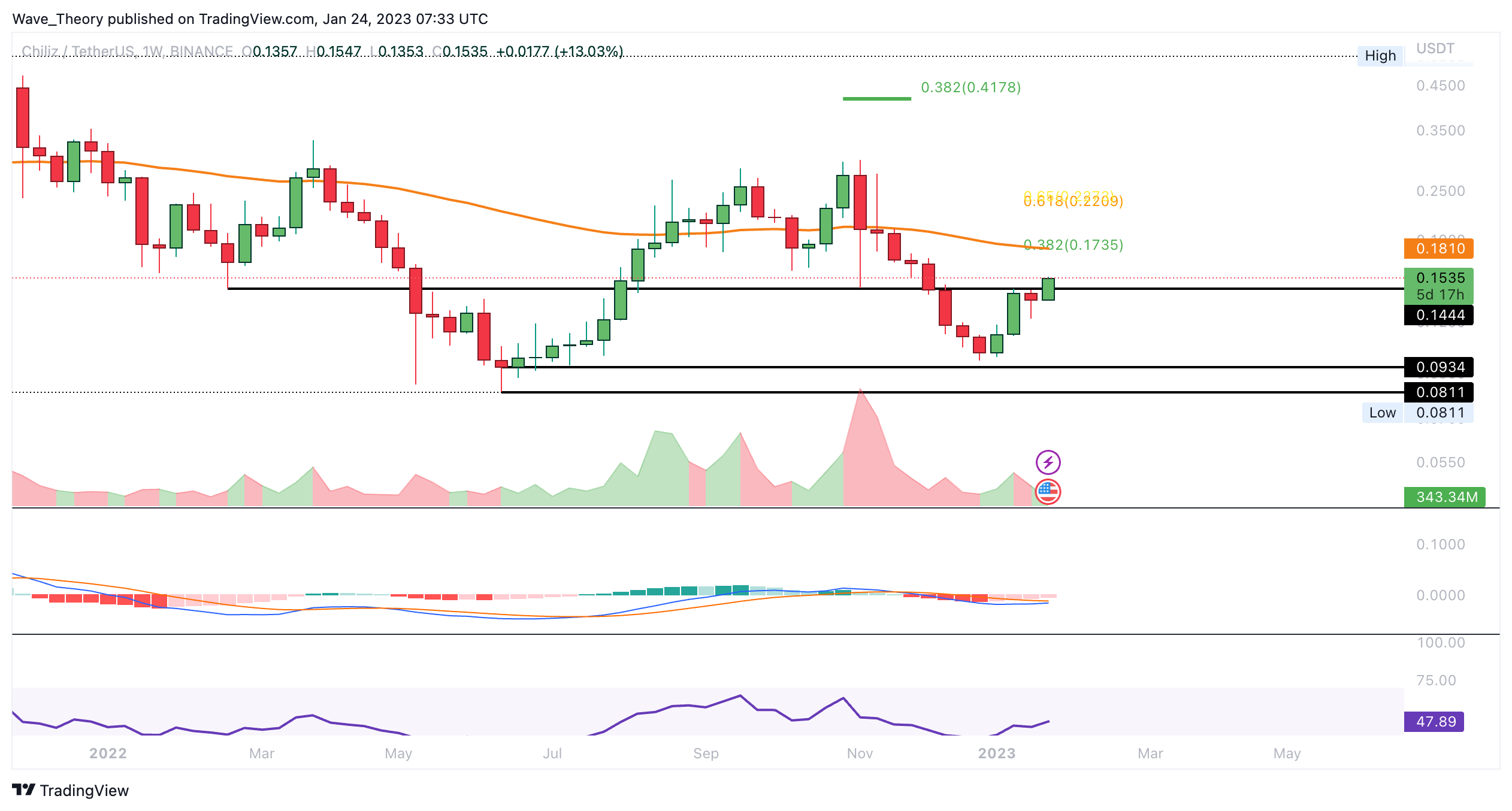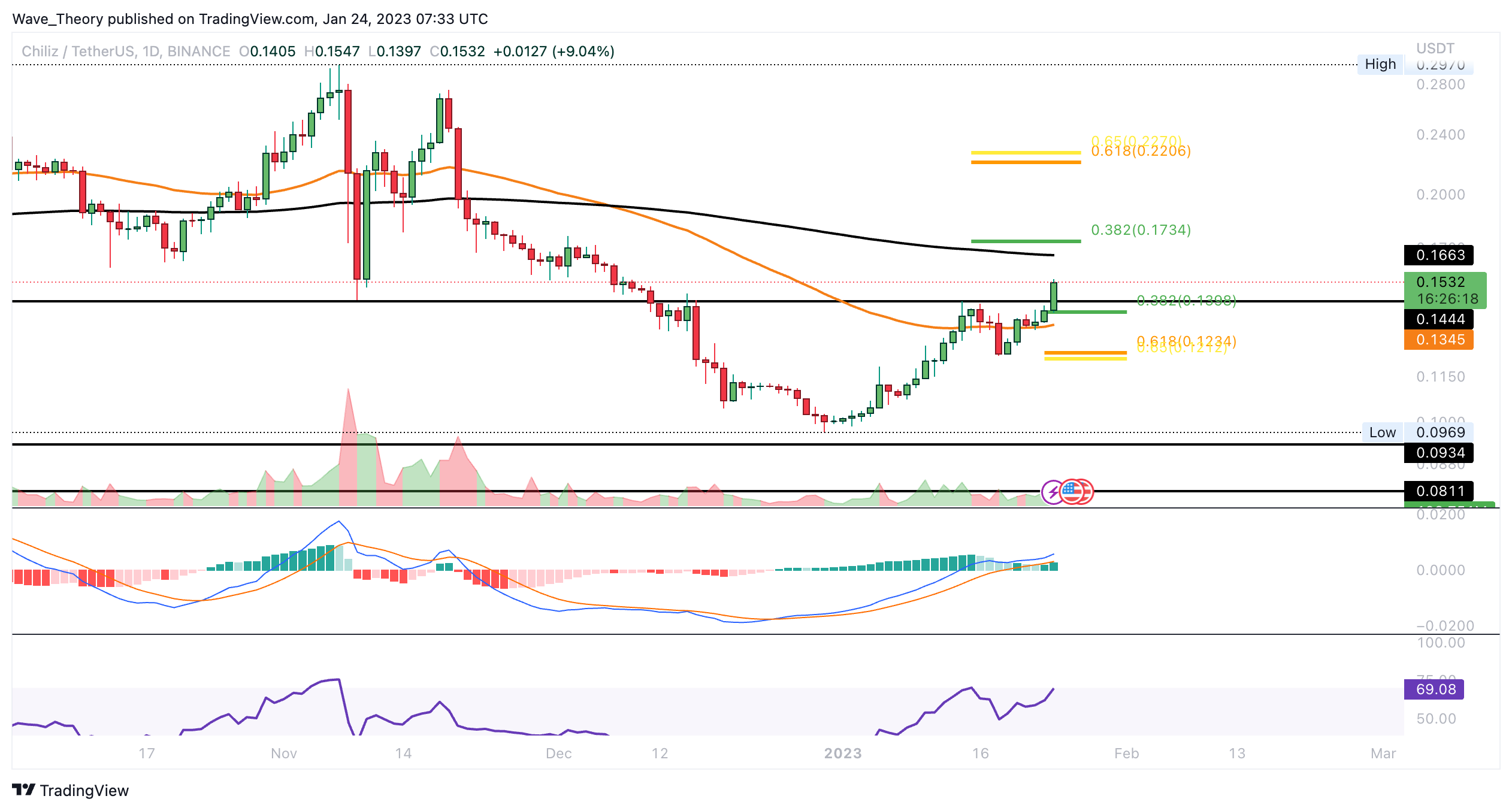 Dennoch könnte CHZ stark am 0,382 Fib Widerstand bei rund 0,1734 USD bärisch abgewiesen werden.