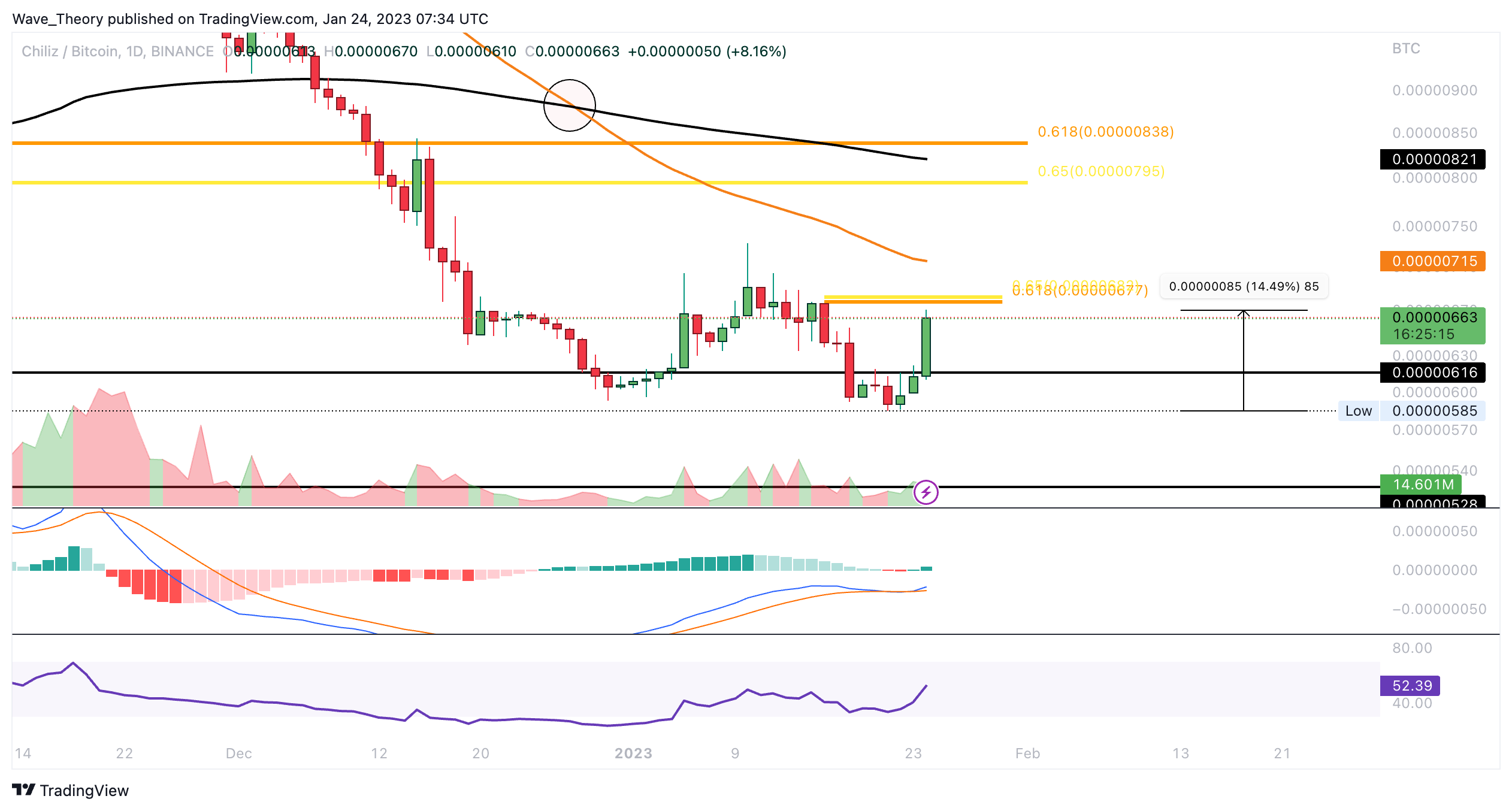 Nach unten hin findet CHZ nach wie vor zwischen rund 0,0000053 BTC und rund 0,00000616 BTC signifikante Unterstützung.