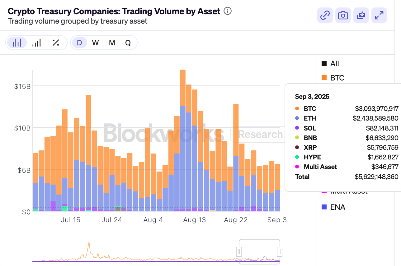 Blockworks Research-Daten vom 3. September zeigten, dass BTC und ETH den Treasury-Handel dominierten, mit einem kombinierten Wert von über 5,5 Mrd. USD. BNBs Anteil von 6,6 Mio. USD hebt seinen steilen Aufstieg hervor.