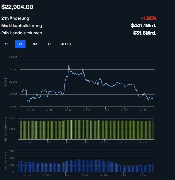 Bei Redaktionsschluss beträgt die Marktkapitalisierung aller Kryptowährungen weltweit etwas über 1,1 Billionen US-Dollar. Der Bitcoin Kurs rangiert in den letzten 24 Stunden zwischen 22.648 und 23.404 US-Dollar gehandelt.