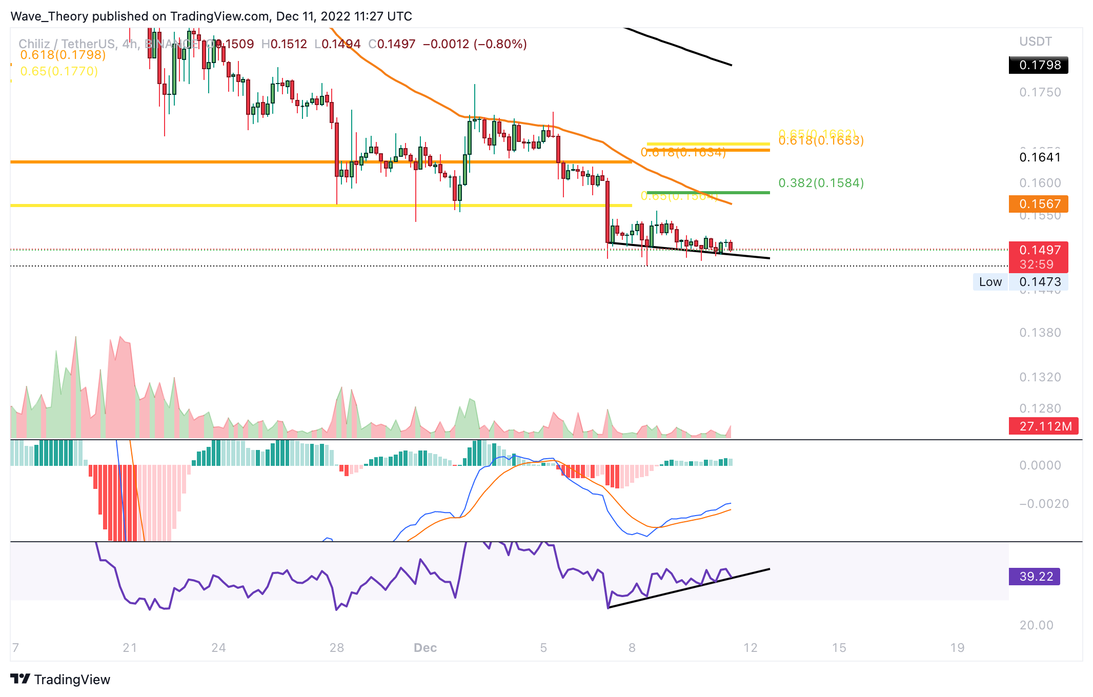 Darüber hinaus sind die MACD Linien bullisch überkreuzt und das Histogramm des MACDs wechselt zwischen bullischen und bärischen Bewegungen. Sollte CHZ noch etwas tiefer fallen, wartet spätestens bei rund 0,145 USD signifikante Unterstützung auf CHZ.