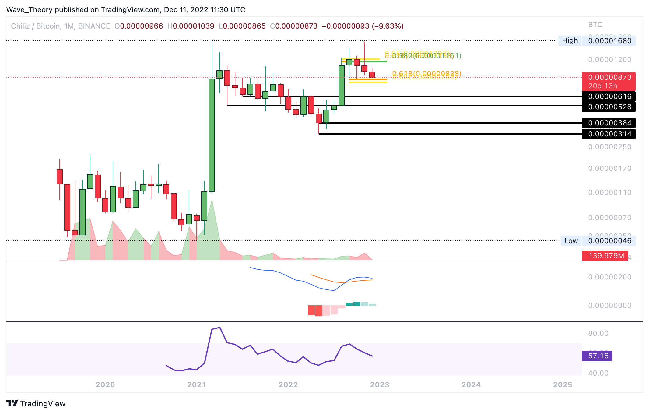 Bricht CHZ die Golden Ratio Unterstützung hingegen bärisch, wartet erst wieder zwischen 0,00000528 BTC und 0,00000616 BTC signifikante Unterstützung auf den CHZ Kurs. Darüber hinaus tickt das Histogramm des MACDs im Monatschart bärisch tiefer und auch die MACD Linien könnten sich bald bärisch überkreuzen.