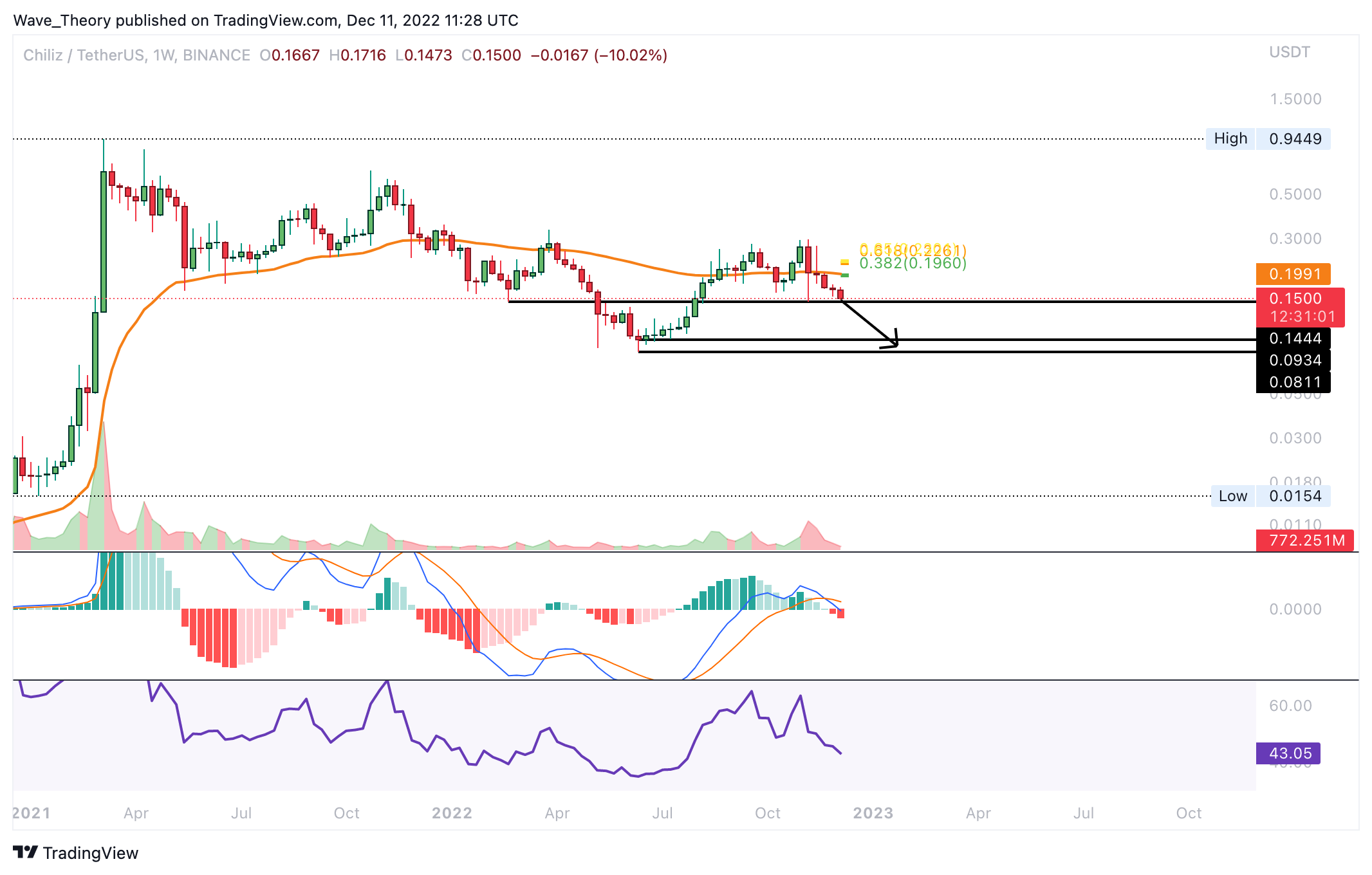CHZ hat gute Chancen, bei rund 0,08 USD den Boden in diesem Bärenzyklus zu finden. Falls nicht, hat CHZ noch einen weiten Weg nach unten.