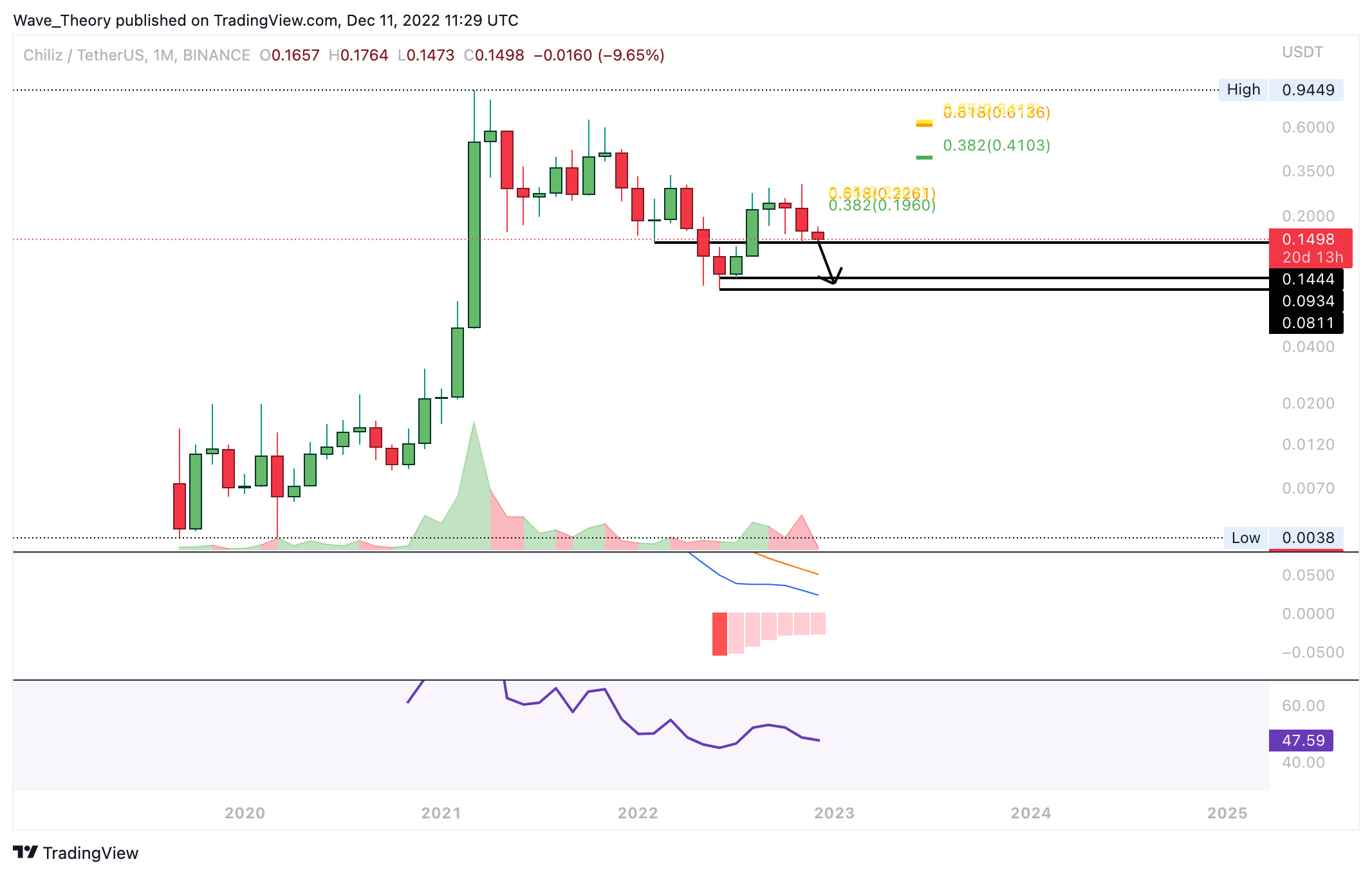 Mittelfristig könnte der CHZ Kurs abstürzen und sich im Kurs halbieren, um die Unterstützung zwischen 0,08 USD und 0,0934 USD zu erreichen. Sollte CHZ die Unterstützung bei rund 0,145 USD brechen, folgt womöglich ein Kurssturz von rund 50 %.