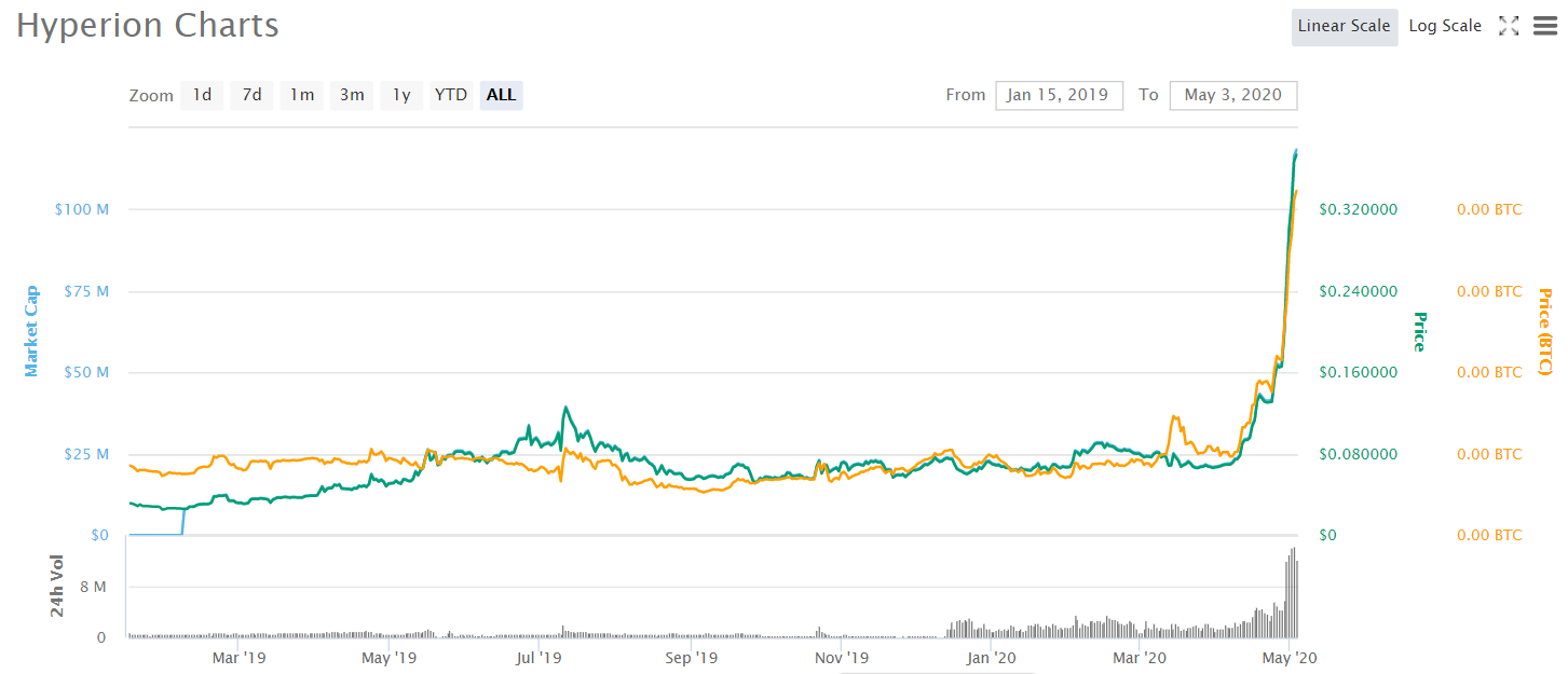 Hyperion (HYP) pumpt derzeit heftig. Schon in der letzten Woche war der Token der dezentralen Weltkarte im CMC100-Report vertreten. Auch Hedera Hashgraph (HBAR) konnte in dieser Woche erneut leicht zulegen.