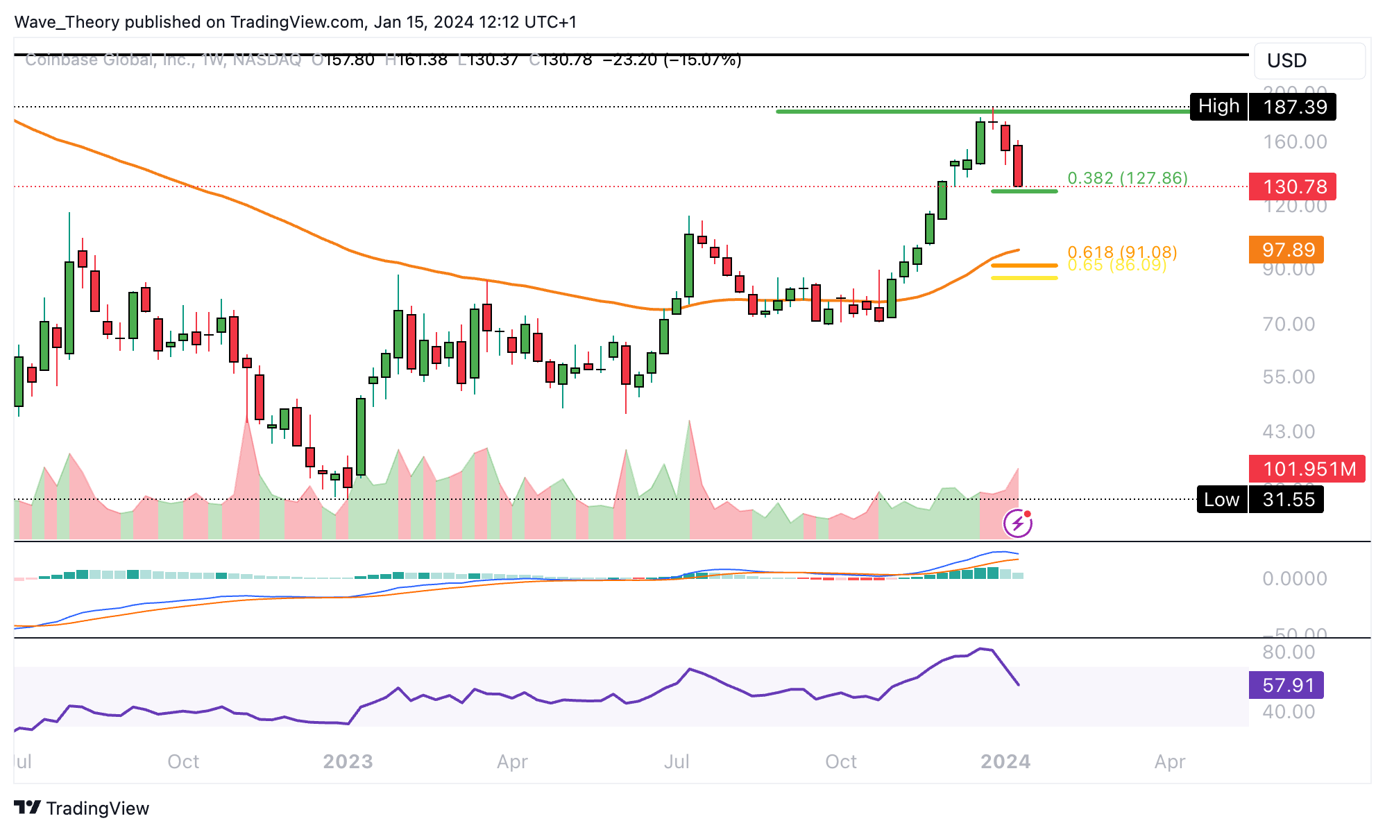 Coinbase stößt jetzt bei rund 128 USD auf signifikante Fibonacci Unterstützung. Sollte diese Unterstützung nicht halten, wartet an der Golden Ratio bei rund 90 USD die nächste signifikante Fib Unterstützung.