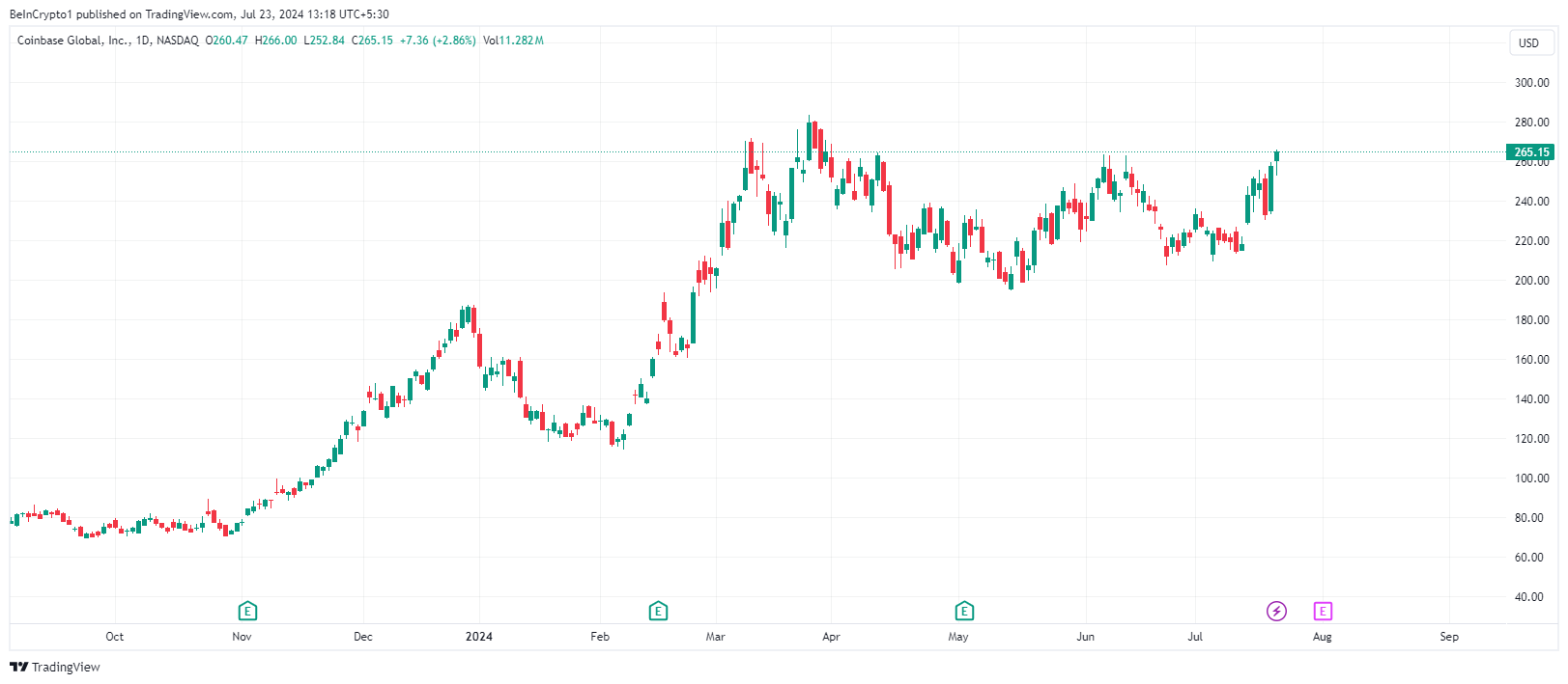 Nach dieser Entwicklung ist die Coinbase-Aktie, COIN, um fast zehn Prozent gestiegen und wird derzeit für 265,15 USD gehandelt.