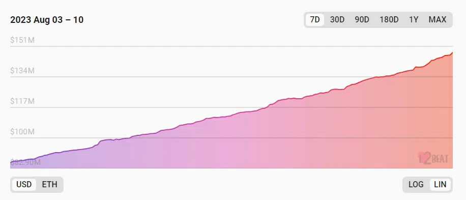 Zudem stieg der TVL laut L2beat seit letzter Woche bis auf 147 Millionen USD – ein beeindruckender Anstieg von 72 %. Damit rangiert Base auf Platz fünf der größten L2s.