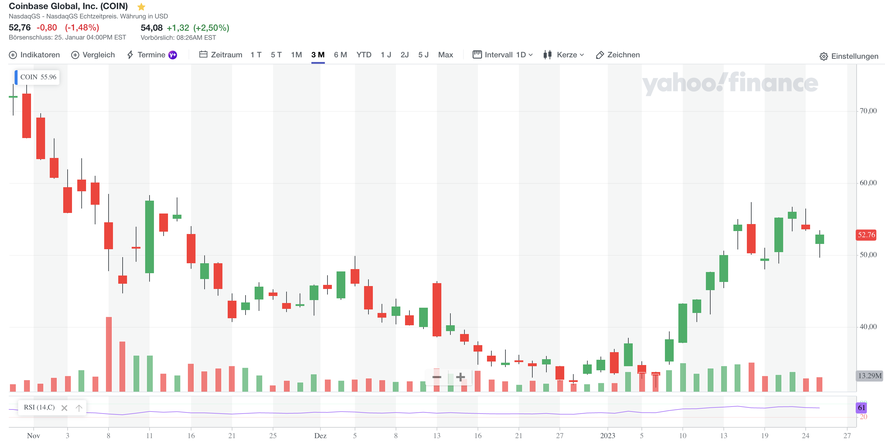 Der Aktienkurs von Coinbase (Nasdaq-Ticker: COIN) hält sich trotz negativer Presse weiterhin über der Marke von 50 US-Dollar, legt heute vorbörslich sogar um 2,5 % zu auf über 54 US-Dollar.