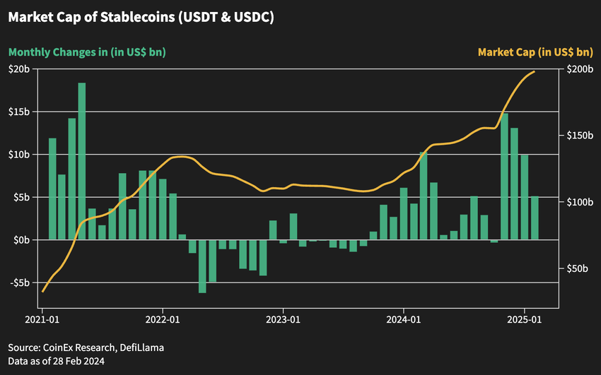 Trotz der schwierigen Marktbedingungen blieben Stablecoin-Zuflüsse robust. Im Februar betrugen die Nettozuflüsse 5 Milliarden US-Dollar, was zwar weniger als die 9,9 Milliarden US-Dollar aus dem Januar ist, aber dennoch auf eine anhaltende Liquidität im Markt hinweist. Die aktuellen Muster entsprechen weiterhin denen eines Bullenmarktes.