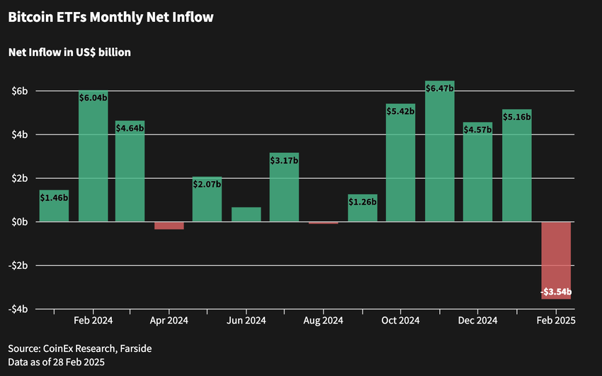 Im Februar verzeichneten Bitcoin-ETFs Nettoabflüsse von insgesamt 3,5 Milliarden US-Dollar – der höchste monatliche Abfluss seit der Einführung von Bitcoin-ETFs.