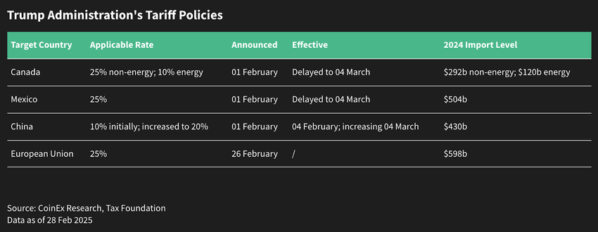 Der Kryptomarkt litt im Februar auch unter makroökonomischem Druck. Die neuen Zollpläne der Trump-Regierung befeuerten Sorgen vor verschärften Handelskonflikten, schwächerem Wirtschaftswachstum und potenziellen Inflationsrisiken.