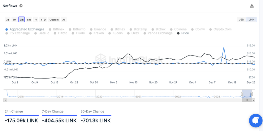 In den letzten 24 Stunden sank der LINK-Bestand von zentralen Börsen um 175.090 Coins. In den letzten sieben Tagen ist der Saldo um mindestens 400.000 LINK-Coins gesunken.