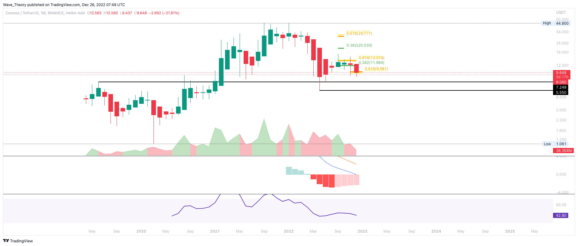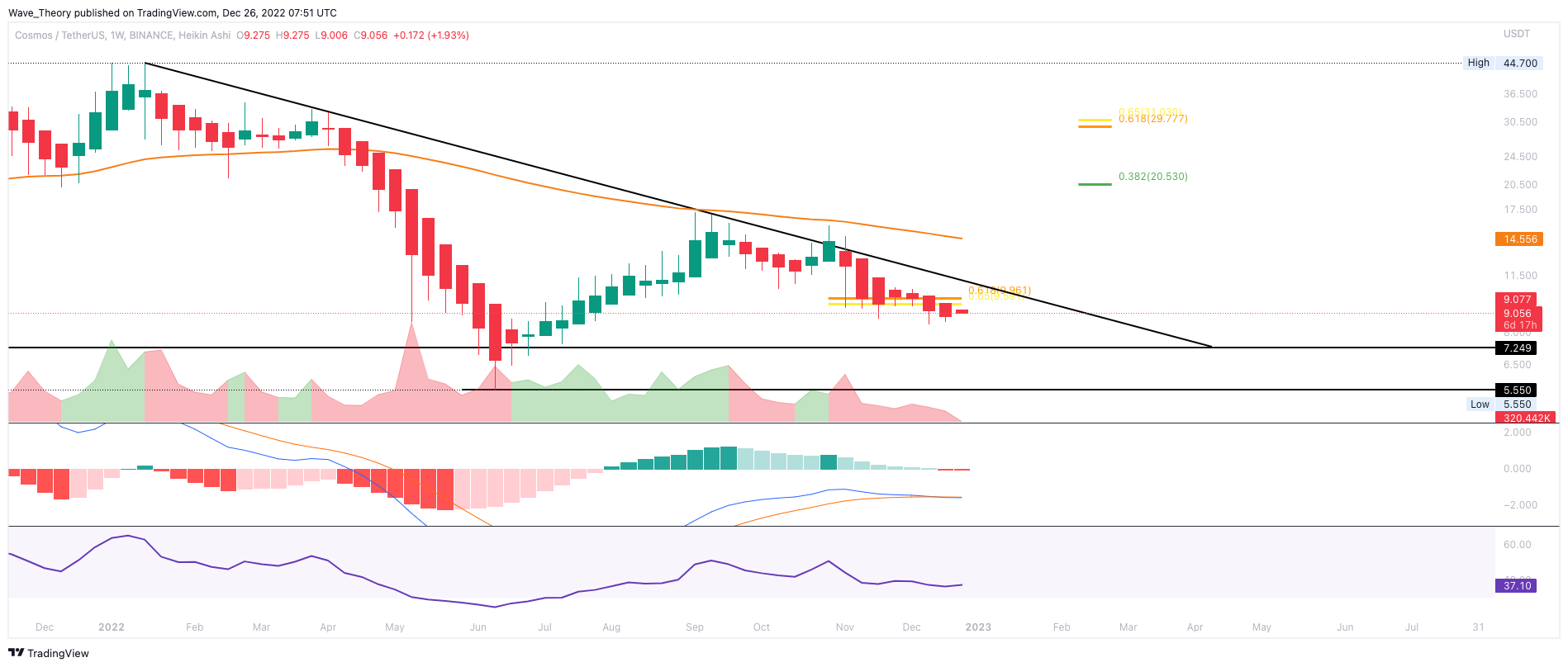 Wird der Cosmos Kurs die Golden Ratio Unterstützung bei rund 10 USD brechen, um rund 28 % bis 45 % zu fallen?