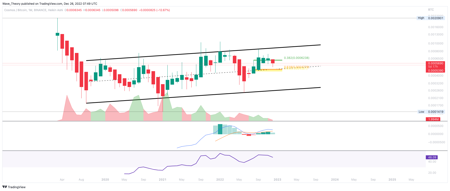 Gegen BTC bewegt sich der Cosmos Kurs zur Golden Ratio Unterstützung an der Mittellinie des parallelen Abwärtskanals