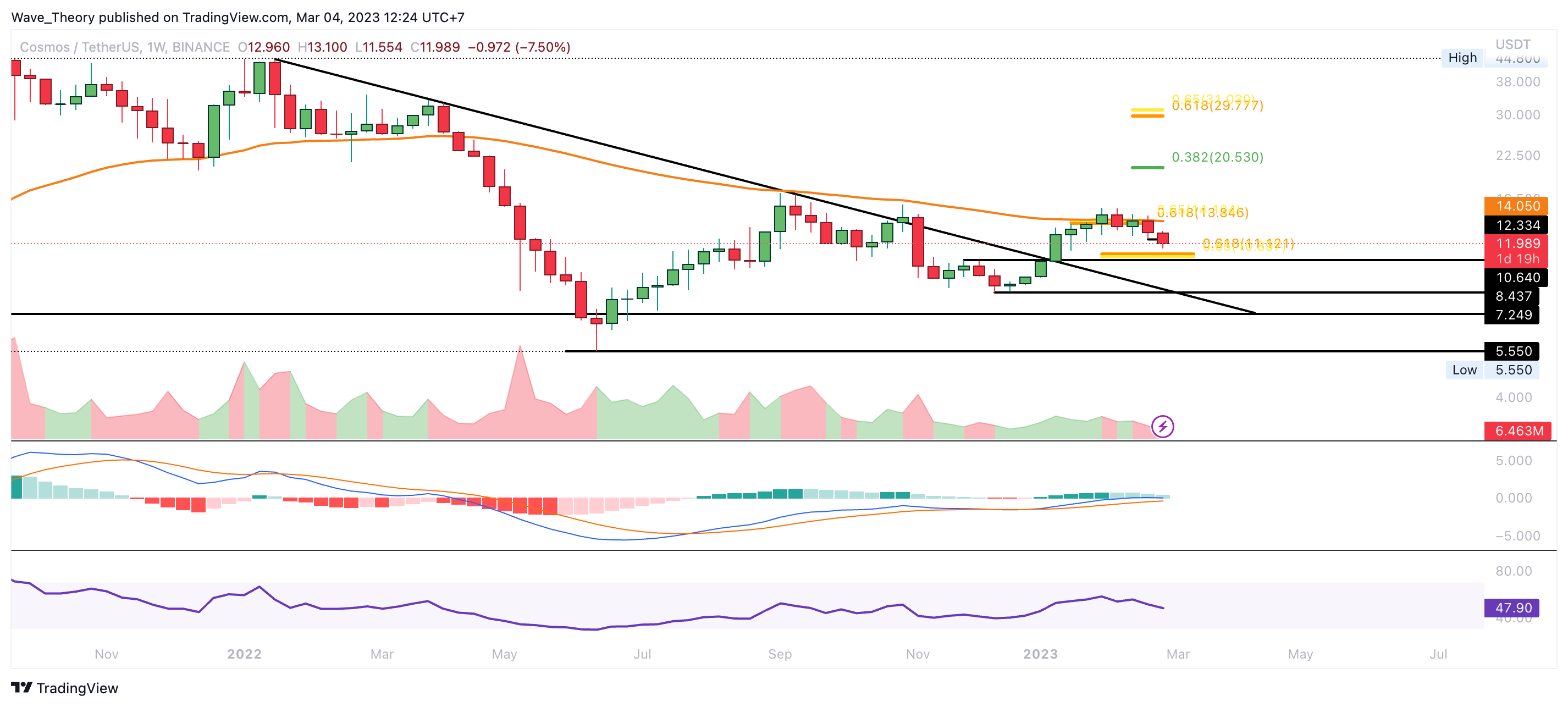 Sollte Cosmos nicht an der Golden Ratio Unterstützung bei rund 11 USD bullisch abprallen, wartet spätestens zwischen rund 8,4 USD und rund 10,64 USD signifikante Unterstützung auf den ATOM Kurs. Sollte Cosmos bullisch abprallen, könnte der ATOM Kurs erneut den Versuch unternehmen, den 50-Wochen-EMA Bei rund 14 USD zu brechen. Dann könnte Cosmos den 0,382 Fib Widerstand bei rund 20,5 USD anvisieren.