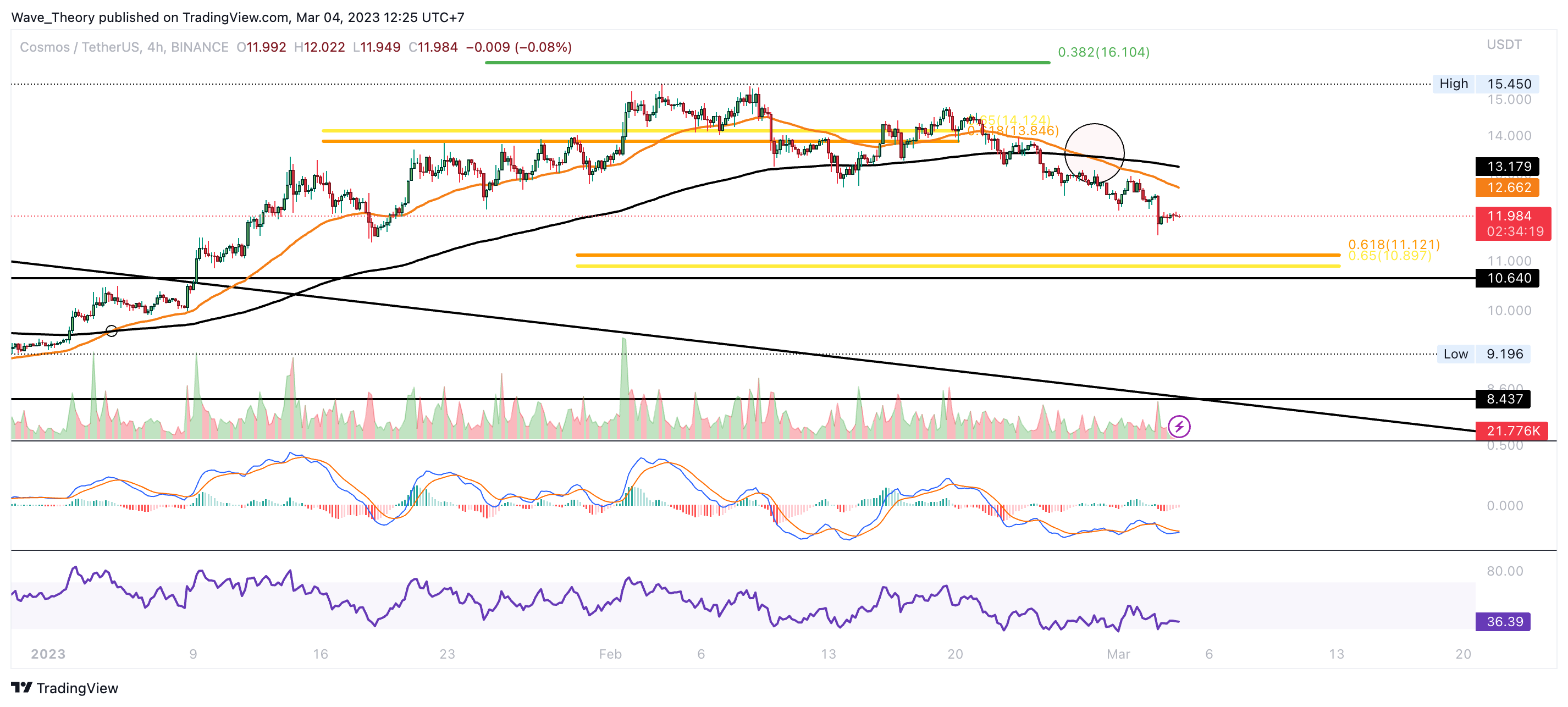 Im 4H-Chart formte sich bereits ein Death Cross, womit der Trend kurzfristig bärisch bestätigt ist. Dennoch könnte Cosmos schon bald bullisch abprallen, denn bei rund 11 USD stößt Cosmos auf signifikante Golden Ratio Unterstützung. Zudem stehen die MACD Linien im 4H-Chart kurz vor einer bullischen Überkreuzung und das Histogramm des MACDs tickt bullisch höher. Der RSI prallte dabei bereits ein zweites Mal an überverkauften Regionen ab und befindet sich derzeit in neutralem Gebiet.