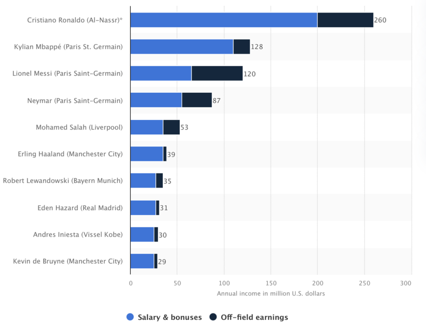 Im November 2022 schätzte The Sporting News Ronaldos Vermögen auf etwa 500 Millionen USD während sein neuester Vertrag mit dem saudi-arabischen Club Al-Nassr FC ihm etwa 220 Millionen USD pro Jahr einbringt. Ronaldo verdient auch Geld durch seine Bekleidungsmarke CR-7 und verschiedene Accessoires und Werbeverträge.