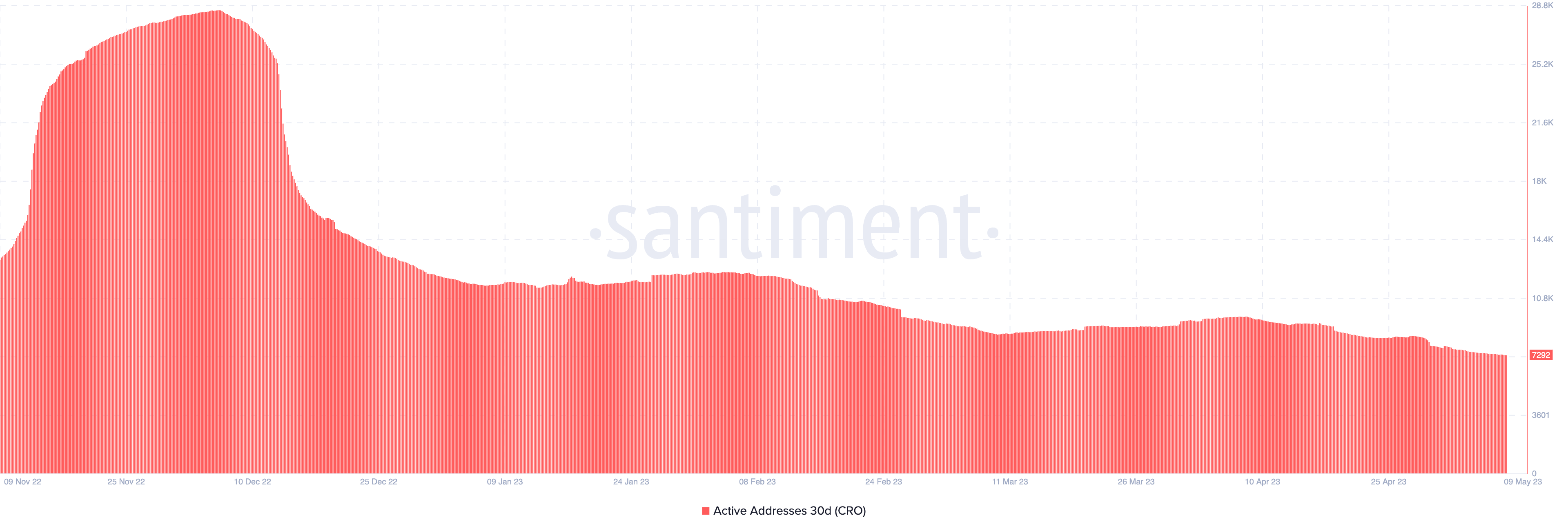 Wenn man sich die monatlich aktiven Adressen (MAA) ansieht, wird ebenfalls ein starker rückläufiger Trend deutlich. Dies zeigt, dass das Interesse und die Nutzung von Crypto.com seit mehreren Monaten stark abgenommen haben.