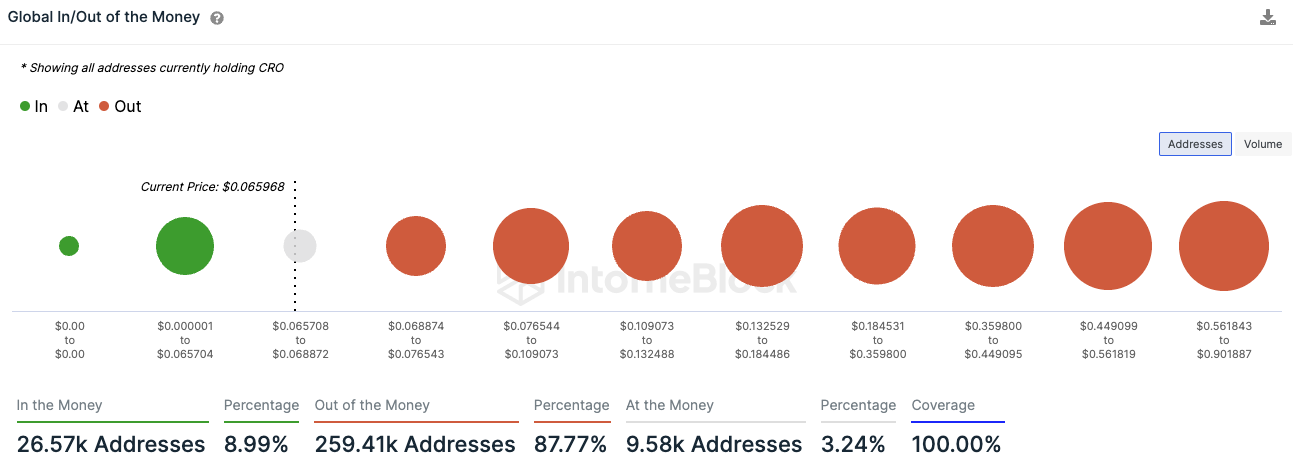 Laut den On-Chain Daten von InToTheBlock sind annähernd 90 % der Token Holder im Verlust, wenn sie den CRO Token zum aktuellen Kurs verkaufen. Lediglich 9 % der Adressen, die CRO halten, befinden sich im Plus.