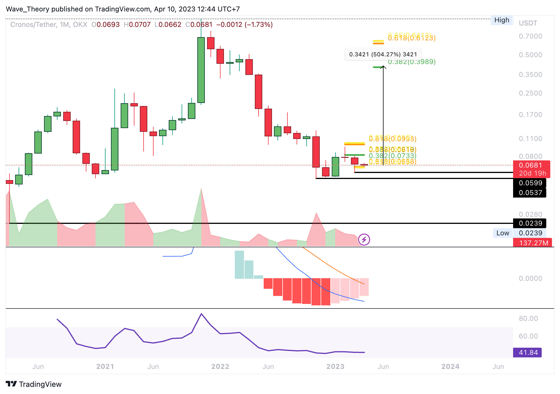 Bricht der CRO Kurs die Golden Ratio Unterstützung bei rund 0,065 USD hingegen bärisch, wartet erst wieder zwischen rund 0,0537 USD und rund 0,06 USD signifikante Unterstützung auf den CRO Token.