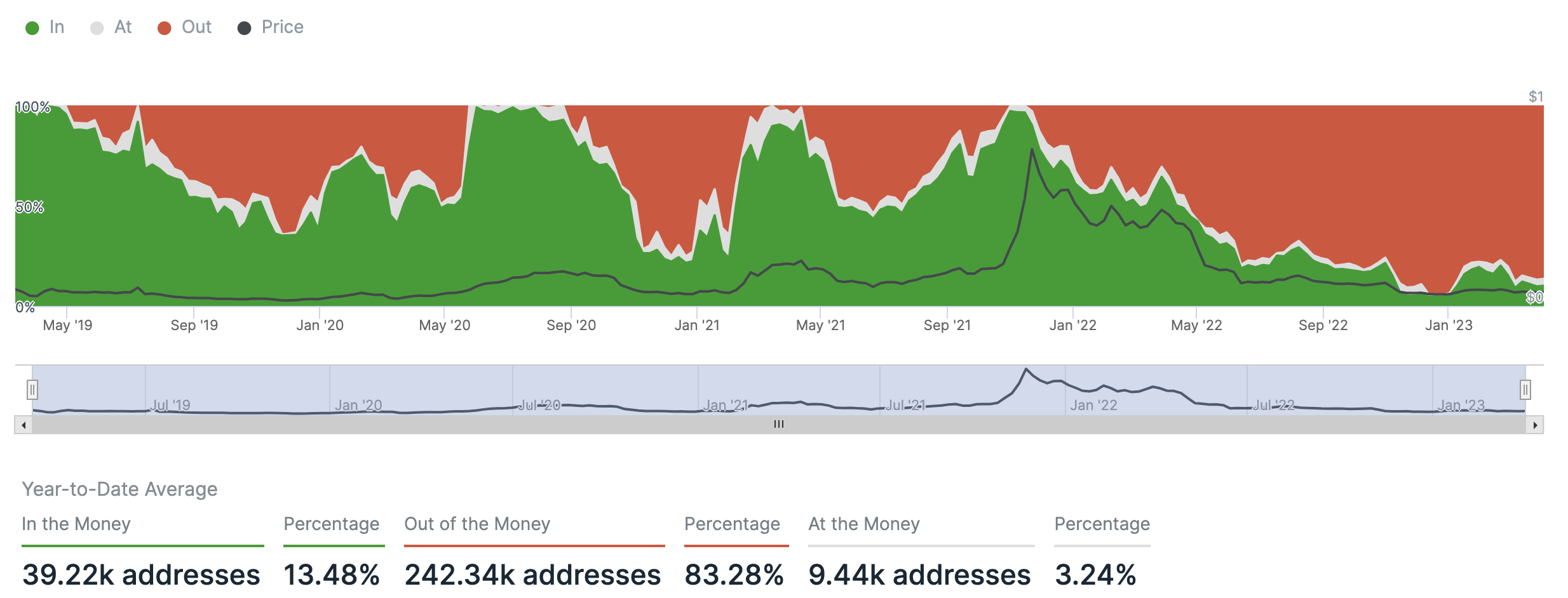 Auch bei Betrachtung der historischen Daten zeigt sich ein ähnliches Bild. Nur 13,5 % der Token Holder sind im Year-to-Date im Kursplus, wenn sie jetzt verkaufen. Da sich die überwältigende Mehrheit der CRO Token Holder bereits seit Mai 2022 im Verlust befindet, könnte sich ein enormer Verkaufsdruck aufbauen, sobald diese Investoren wieder ins Kursplus geraten.
