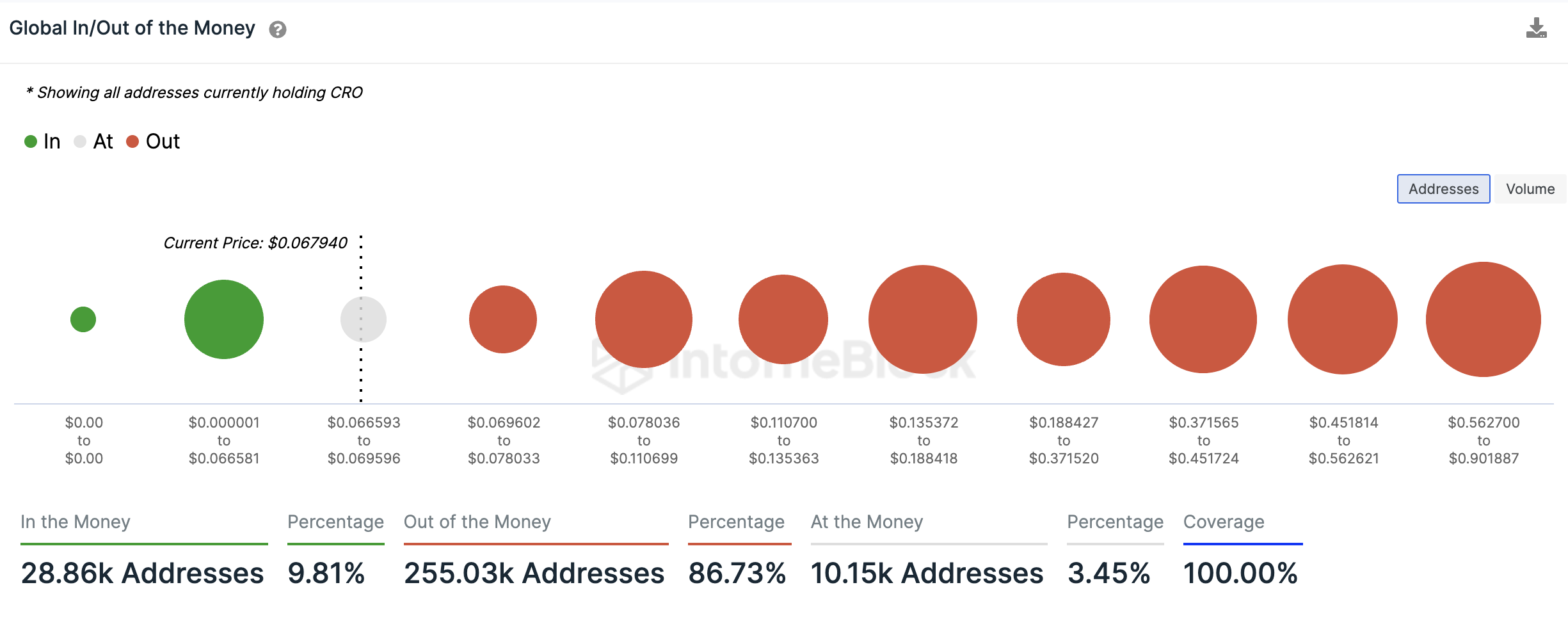 Laut den On-Chain Daten von InToTheBlock sind 86,73 % der Token Holder im Verlust, wenn sie den CRO Token zum aktuellen Kurs verkaufen.