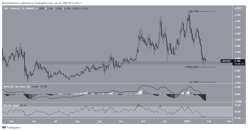 Der RSI (ein Momentum-Indikator), ist unter 30 gefallen. Das ist ein weiteres Anzeichen dafür, dass der Trend bärisch ist. Der CRV Kurs konnte sich zwar über dem unten gezeigten Unterstützungsbereich und über dem Fib-Level bei 2.70 USD halten, allerdings gibt es auf dem Tageschart keine Hinweise dafür, dass wir eine bullische Trendumkehr sehen könnten.