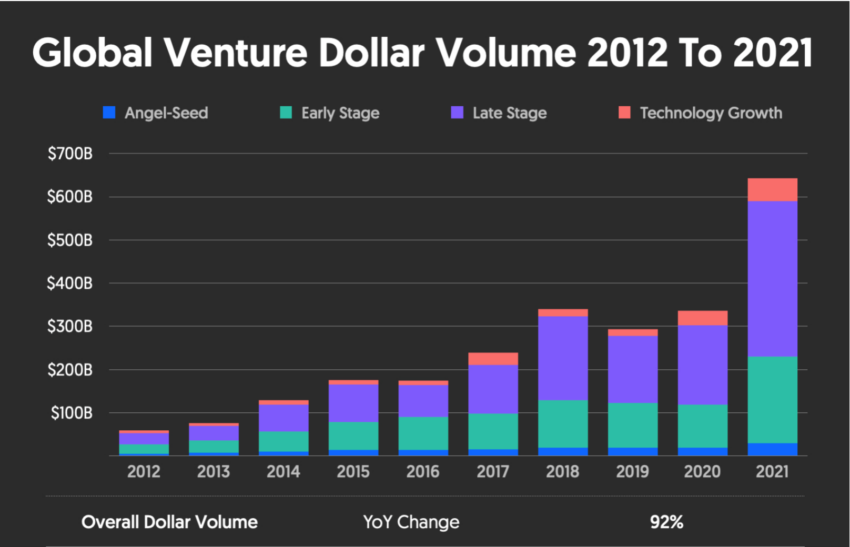 So stieg im Jahr 2021 der Wert des weltweit investierten Risikokapitals auf 612 Milliarden US-Dollar an und nahm damit im Vergleich zum Vorjahr um 108 % zu. Zudem stieg das in US-Dollar weltweite investierte Venture Kapital im 10-Jahresvergleich um 92 % zu – jedes Jahr kam also im Schnitt in etwa die ursprüngliche Investitionssumme von 2012 hinzu.
