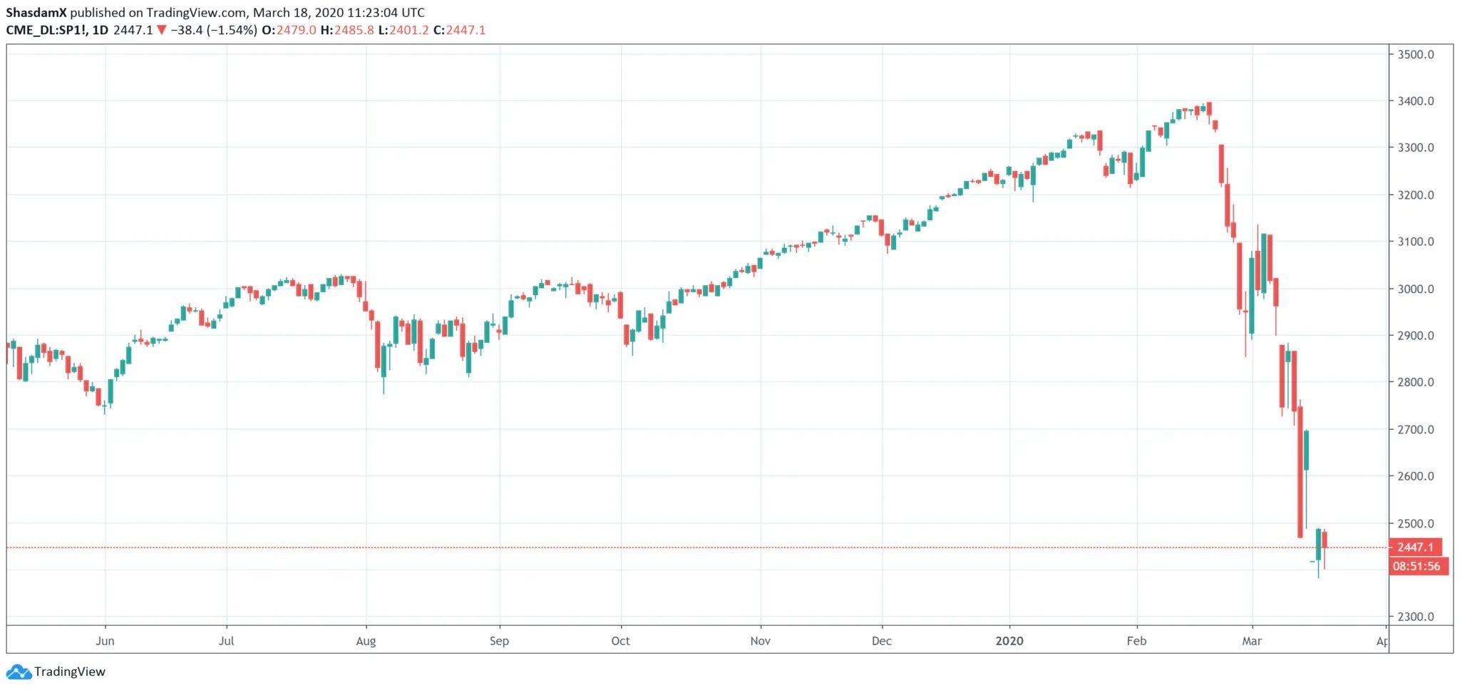 Auch am Montag kam es zu einer Volatilitätsunterbrechung an der Wall Street, wodurch der Handel für 15 Minuten eingestellt wurde. Die war der dritte Vorfall dieser Art innerhalb einer Woche. Der jüngste Rückgang der Aktienkurse hat die Federal Reserve zu einer Notfallsenkung der Leitzinsen veranlasst, um der schwächelnden Wirtschaft auszuhelfen. Auf den Finanzmärkten gab es seit der Lehmann-Pleite 2008 keinen Ausverkauf in diesem Ausmaß.