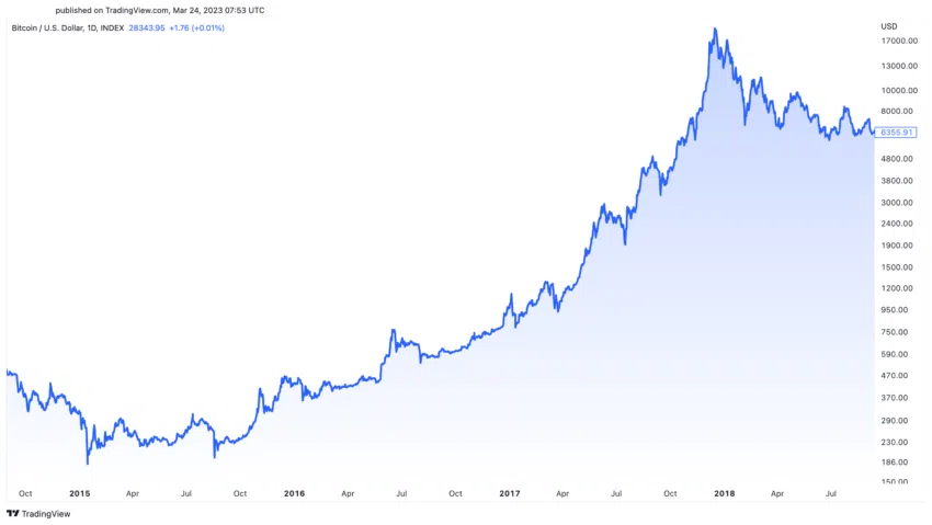 Nach dem Halving 2016 stieg der Bitcoin Kurs von etwa 650 USD im Juli auf fast 20.000 USD im Dezember 2017. Die Marktstimmung war in dieser Zeit überwiegend positiv. Dies war auf die erhöhte Aufmerksamkeit der Mainstream-Medien, vermehrte Initial Coin Offerings (ICOs) und den Einstieg institutioneller Anleger:innen zurückzuführen.
