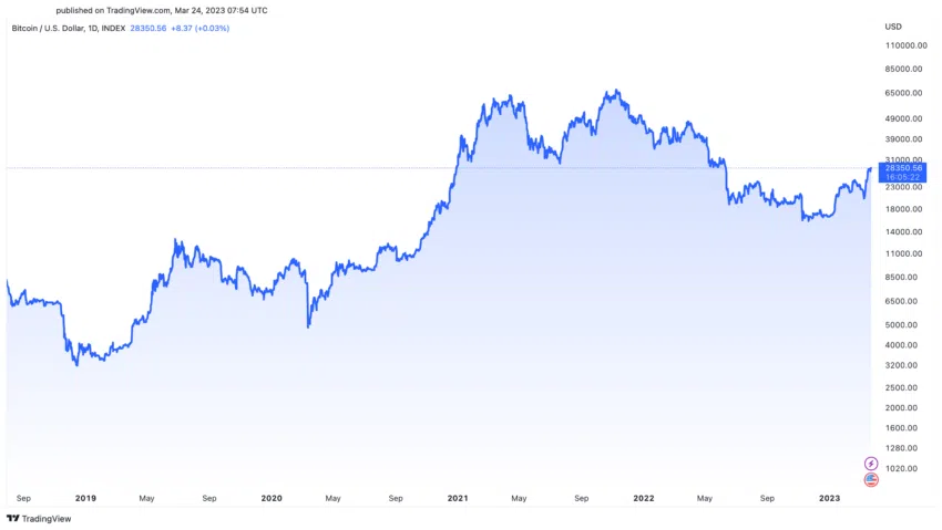 Im Jahr 2020 stieg der Kurs infolge des Halvings von etwa 9.000 USD im Mai auf ein Allzeithoch von ca. 69.000 USD im November 2021. Die Preisentwicklung 2020 war vor allem durch ein erhöhtes institutionelles Interesse gekennzeichnet. Damals traten große Unternehmen und Investmentfonds dem Kryptomarkt bei.