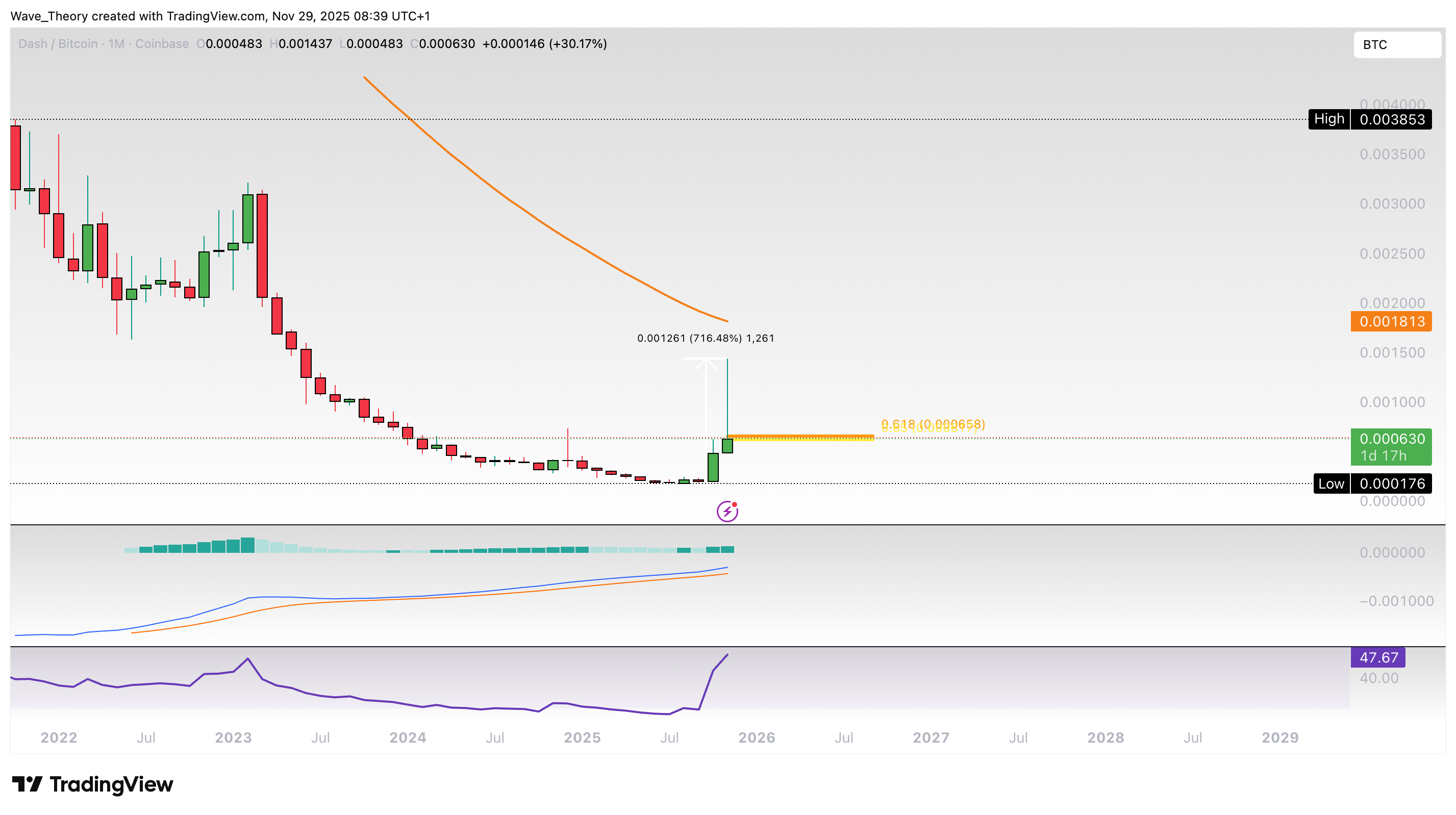 Es ist also sehr wichtig für den weiteren Verlauf, dass sich Dash darüber hält. Auch gegen Bitcoin ist Dash in diesem Monat wieder stark korrigiert, nachdem er zuvor 716,5 % im Kurs steigen konnte.