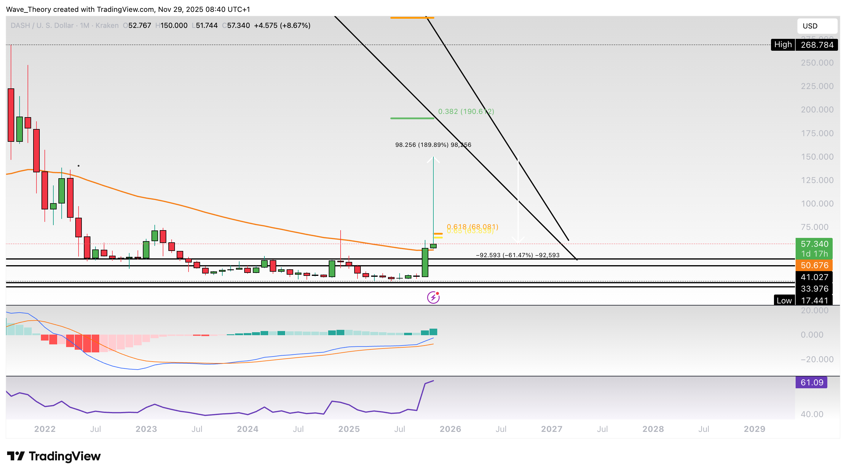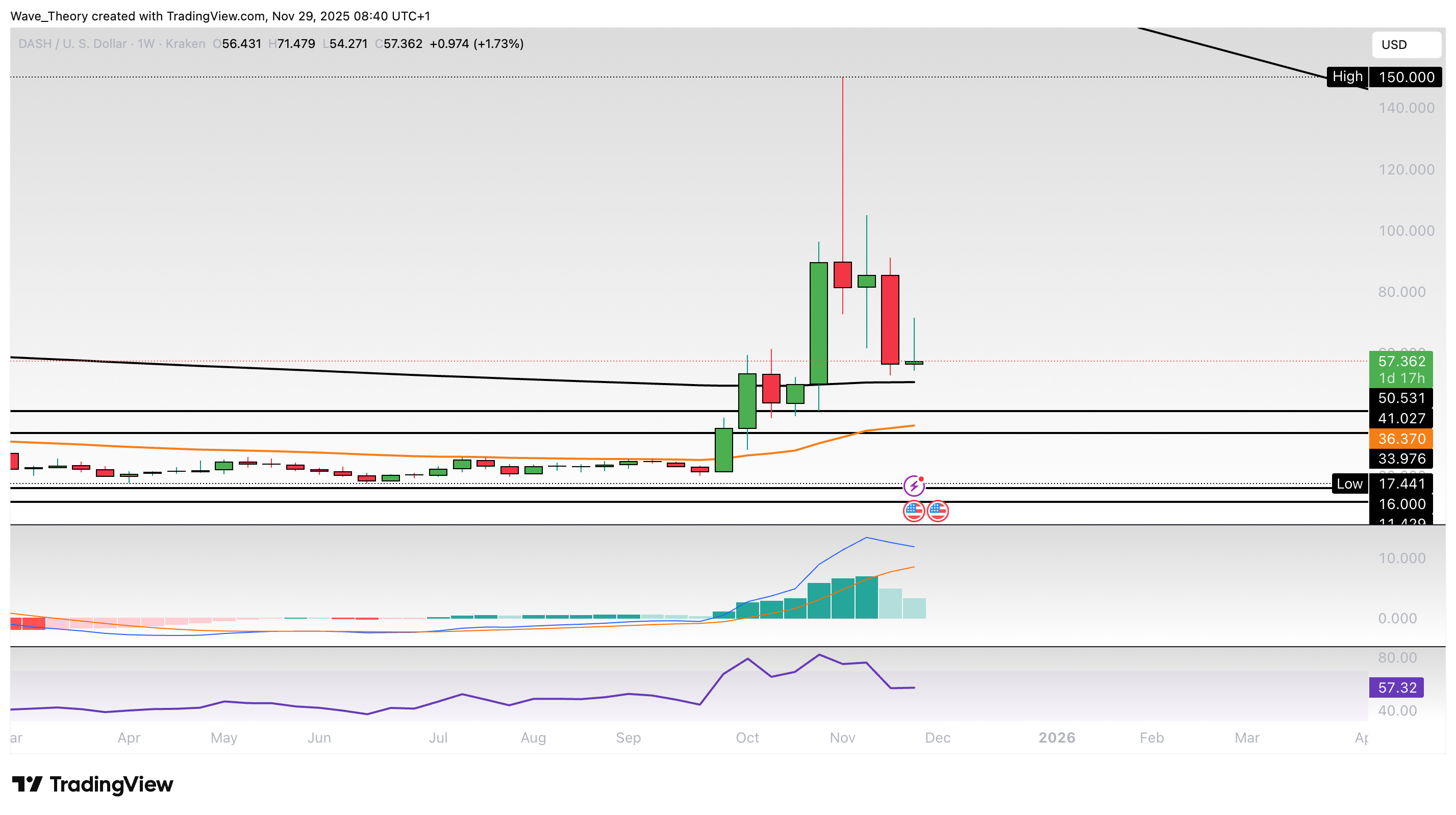 Sollte die 50-Monate-EMA Unterstützung nicht halten können, wartet spätestens zwischen rund 34 USD und 41 USD signifikante Unterstützung auf den DASH Kurs. Dort fungiert zudem der 50-Wochen-EMA als zusätzliche Unterstützung.
