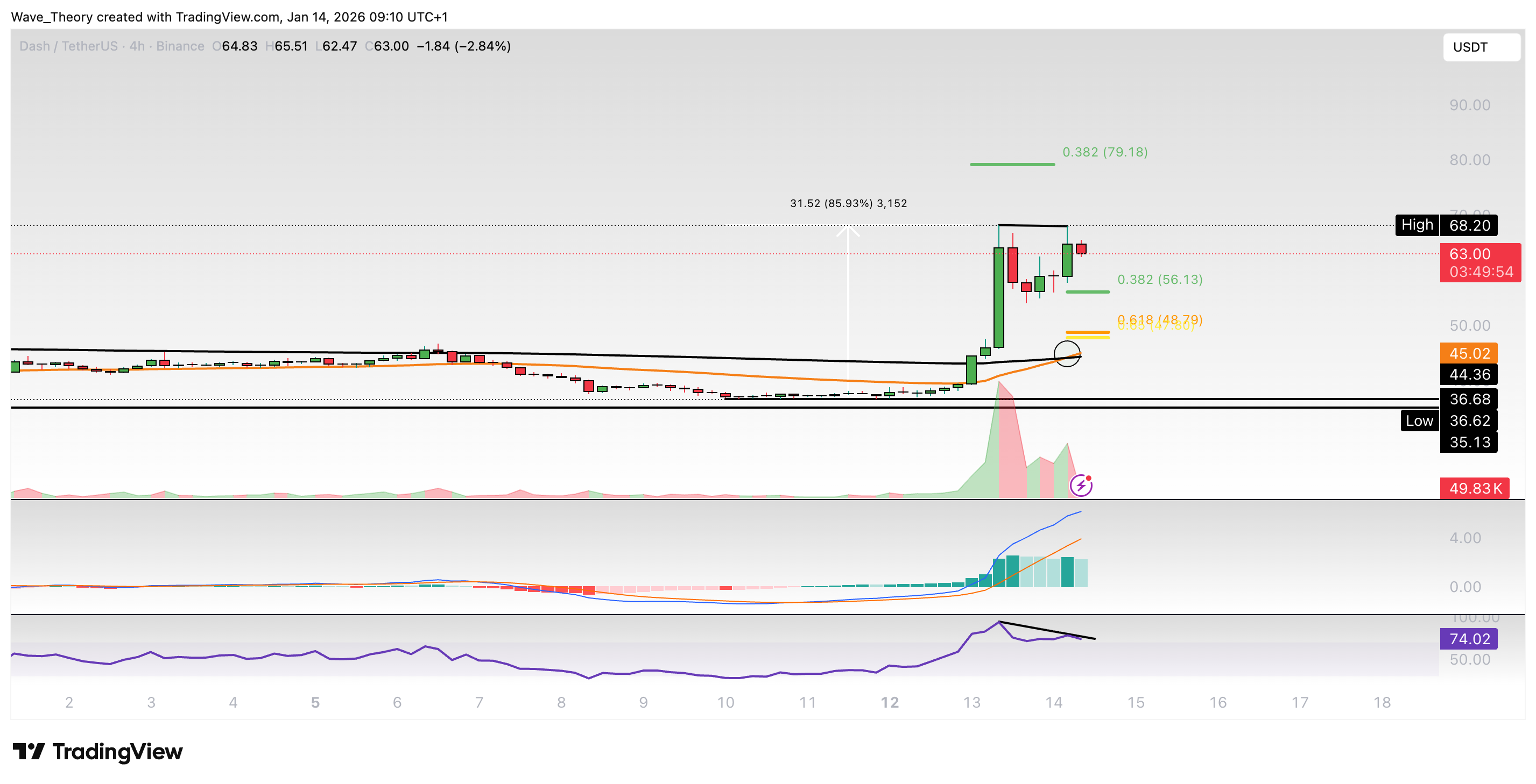 Damit hat sich der Kurs nahezu verdoppelt – und das innerhalb von weniger als drei Tagen. Damit warten jetzt bei rund 79 USD und 106 USD die nächsten signifikanten Fibonacci Widerstände.