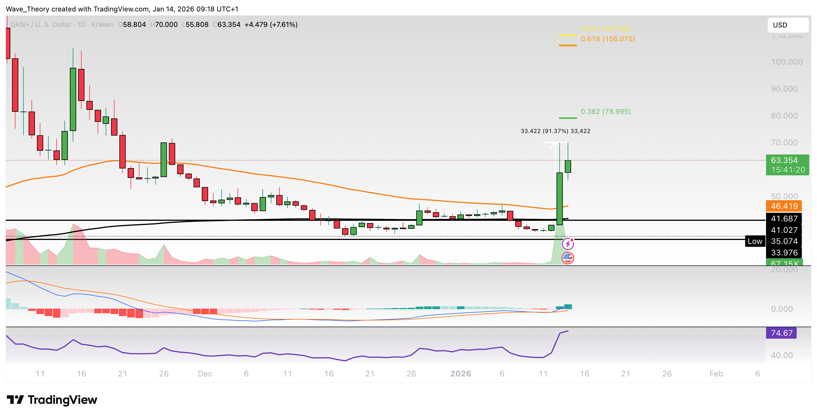 Der DASH Kurs konnte erfolgreich an der Unterstützung zwischen rund 34 USD und 41 USD bullisch abprallen. Seit Sonntag ist der Kurs dabei rund 91,4 % gestiegen – seit Montag sind es knapp 90 %.