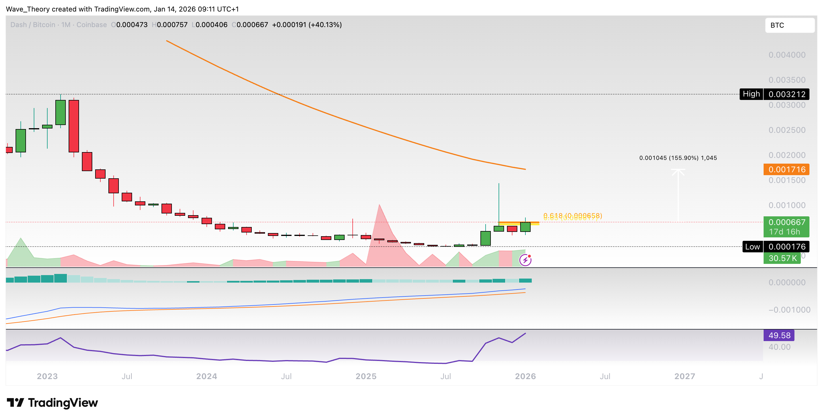 Gegen BTC stößt DASH jetzt bei rund 0,00066 BTC auf signifikanten Golden Ratio Widerstand. Wenn Dash diesen Widerstand überwindet, könnte er den 50-Monate-EMA bei rund 0001716 BTC anvisieren.