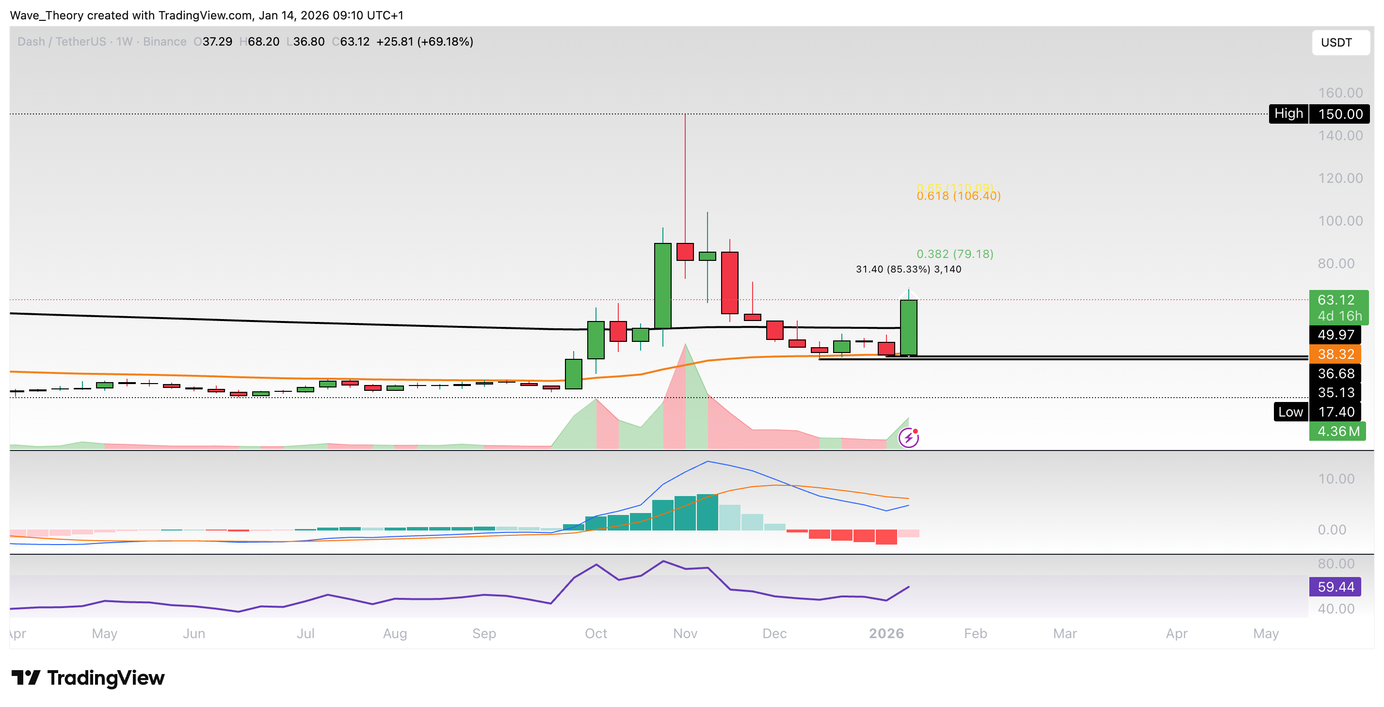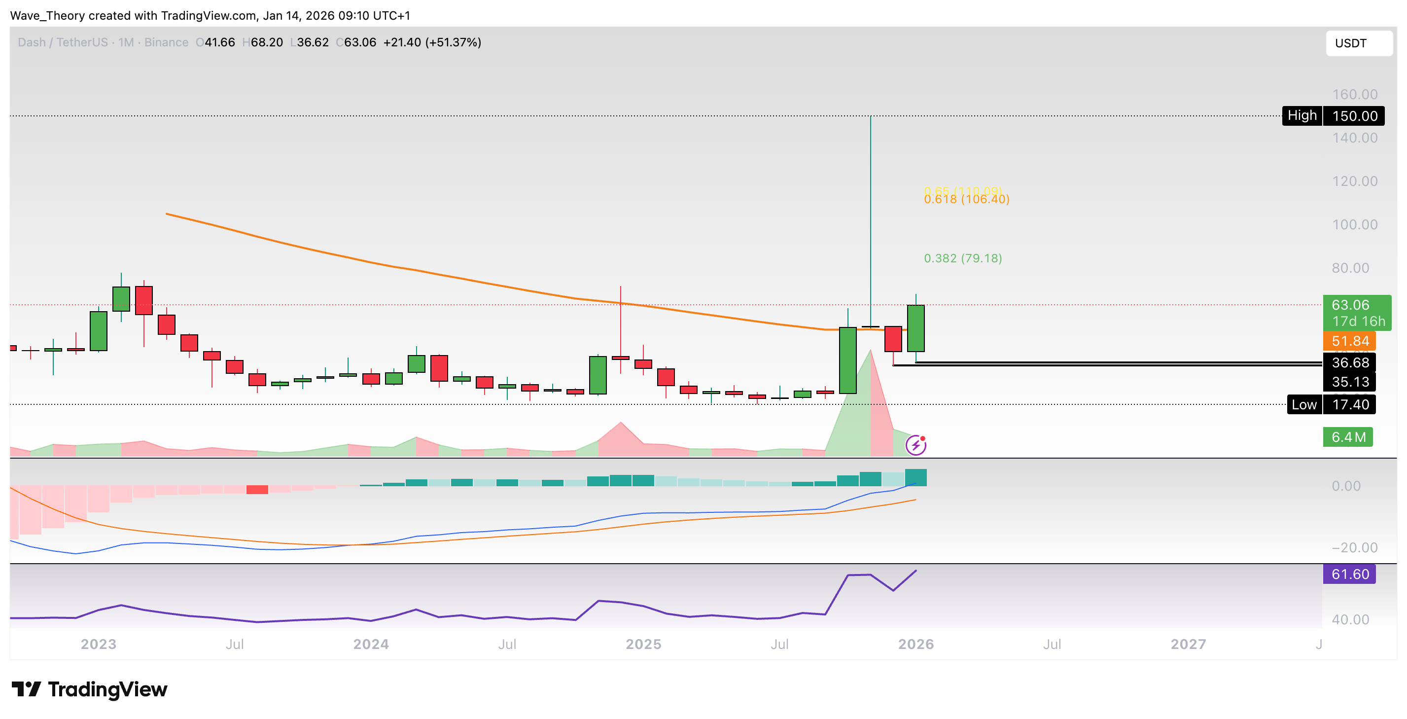 Im Monatschart sieht es in diesem Monat danach aus, dass DASH den 50-Monate-EMA Widerstand bei rund 52 USD überwindet. Ein Monatsschlusskurs darüber ebnet den Weg zu den Fib Niveaus bei rund 79 USD respektive 106 USD.