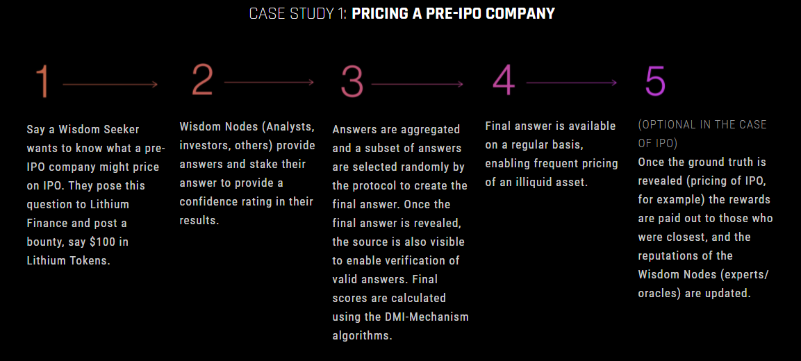 „Gute Frage! Die Lithium Wisdom Nodes sind verfügbar, um viele Arten von Preisfragen zu beantworten. Ein Protokoll wie dieses hat es noch nie gegeben und es hat die Macht, viele Arten von Vermögenswerten zu bewerten. Bisher musste man für die Preisfindung eines illiquiden Vermögenswertes Experten anheuern, Zeugnisse prüfen und manuelle Bewertungen vornehmen – langsam und teuer. Jetzt, mit Lithium Finance, kann eine größere Gruppe von Preisen zu viel günstigeren Preisen und schneller zur Verfügung gestellt werden.“