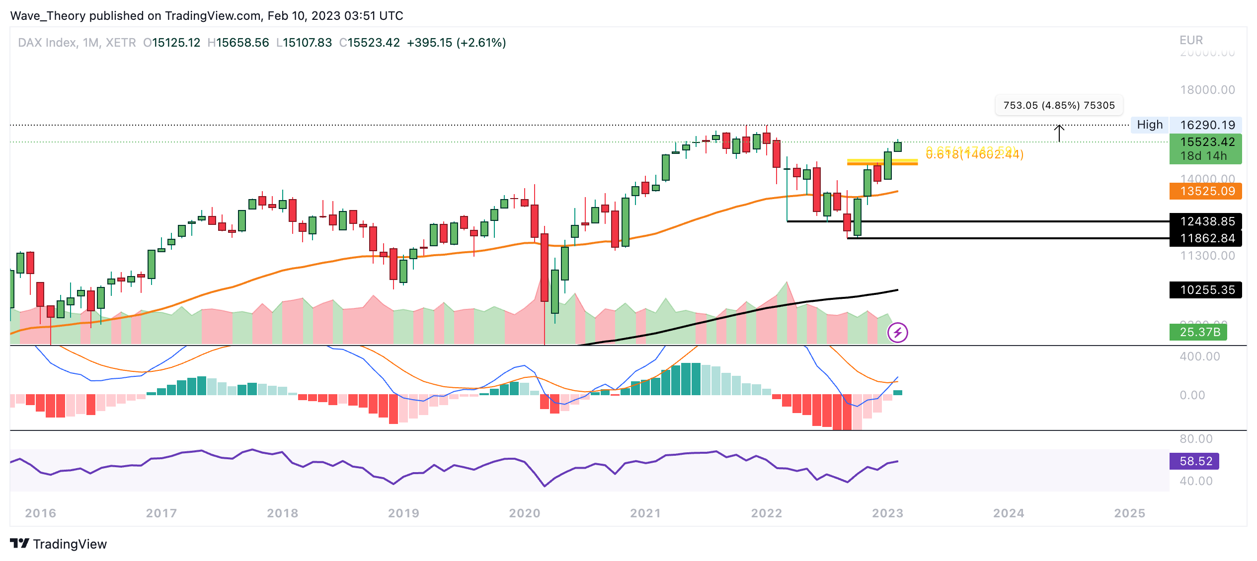 Sollte DAX jetzt korrigieren, findet er bereits bei rund 14.208 und bei rund 13.300 signifikante Fibonacci Unterstützungen. Mittelfristig sieht es aber sehr bullisch für den DAX Kurs aus. Es scheint, als wäre der Bärenmarkt in Deutschland schon vorbei.