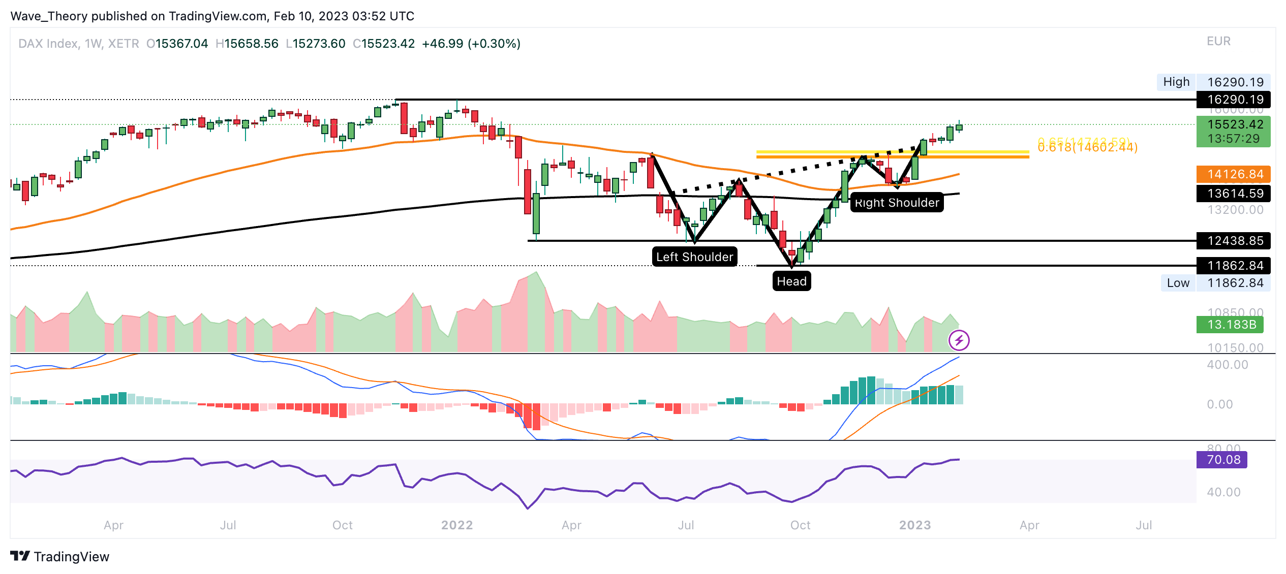 Der DAX Kurs formte ein “Inverse-Head-&-Shoulders” Kursmuster, aus welchem der DAX mit dem Bruch der Golden Ratio bullisch ausbrechen konnte. Darüber hinaus sind auch die MACD Linien im Wochenchart bullisch überkreuzt.