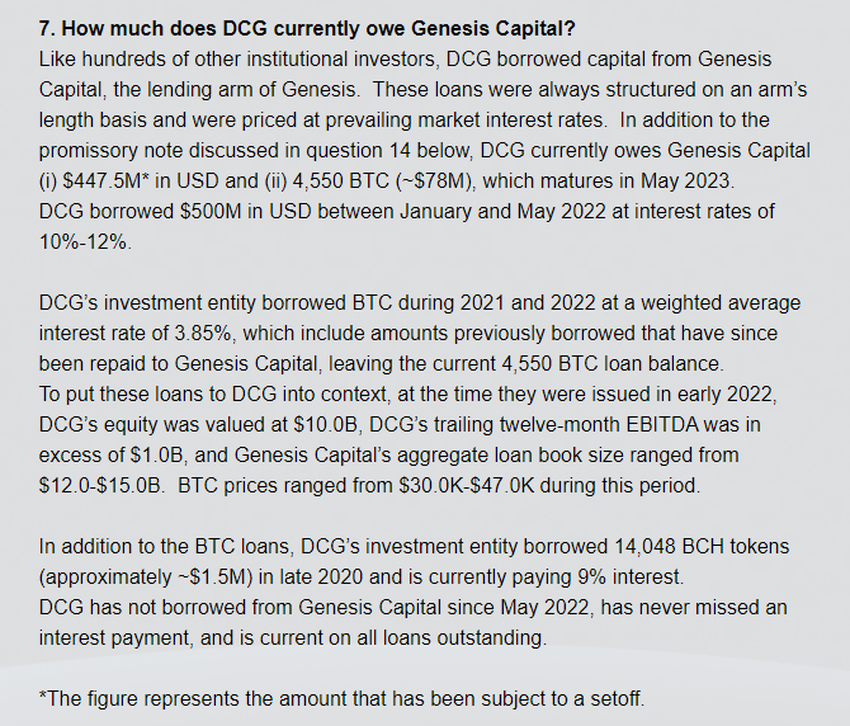 SponsoredIn einem Brief an die Aktionäre Anfang des Monats sagte CEO Barry Silbert, dass DCG Genesis Capital 447,5 Millionen Dollar und 4.550 BTC schulde. Das Darlehen wird im Mai 2023 fällig.