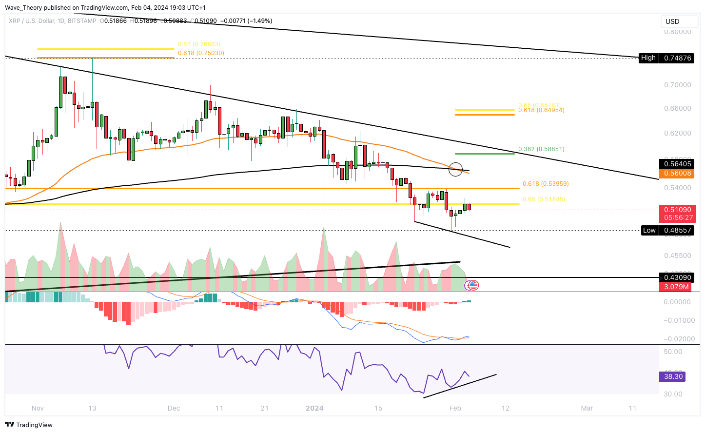 Insgesamt befindet sich Ripple seit zwölf Wochen in einer Abwärtsbewegung. Denn seit Ripple am Golden Ratio Niveau bei rund 0,75 USD bärisch abgewiesen wurde, geht es bergab für den XRP Kurs.