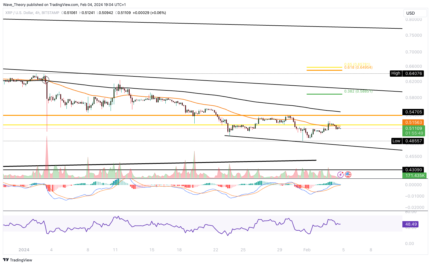 Auch im 4H-Chart von Ripple hat sich bereits ein Death Cross geformt, womit der Trend kurzfristig bärisch bestätigt ist. Zudem tickt das Histogramm des MACDs bärisch tiefer und die MACD Linien könnten sich bald bärisch überkreuzen.